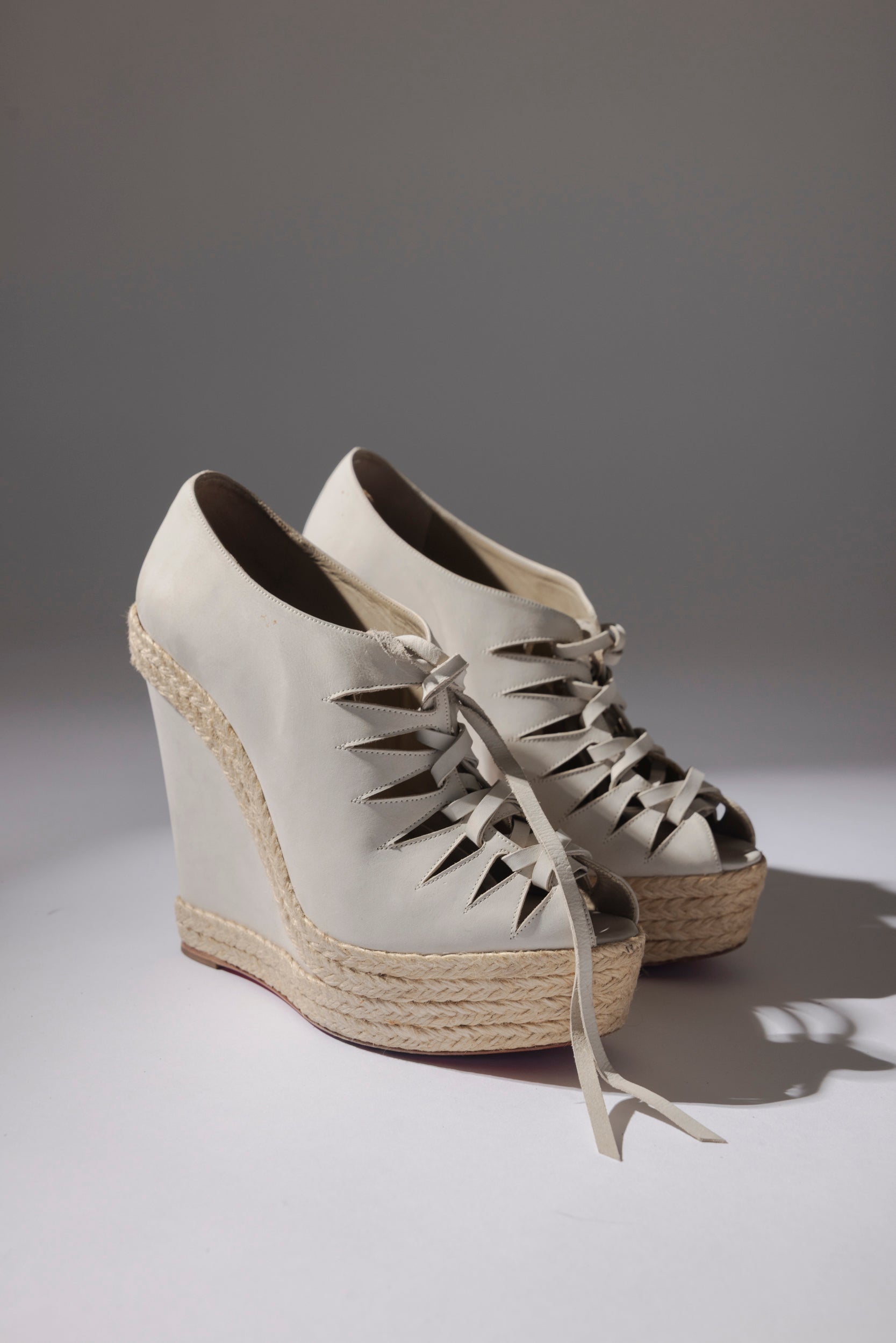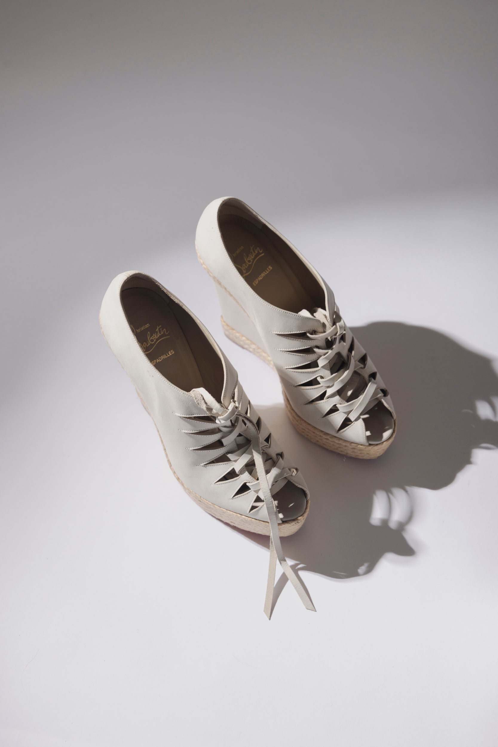 Alpargatas CHRISTIAN LOUBOUTIN. Modelo trenzado de cuña y punta abierta, son la perfecta combinación entre el estilo artesanal mediterráneo y la sofisticación característica de la Maison francesa. Elaboradas en piel beige de alta calidad, destacan por su diseño entrelazado con tiras frontales que aportan un aire fresco y femenino. La plataforma y cuña recubierta en yute trenzado brinda comodidad y estabilidad, elevando la silueta sin sacrificar confort.
