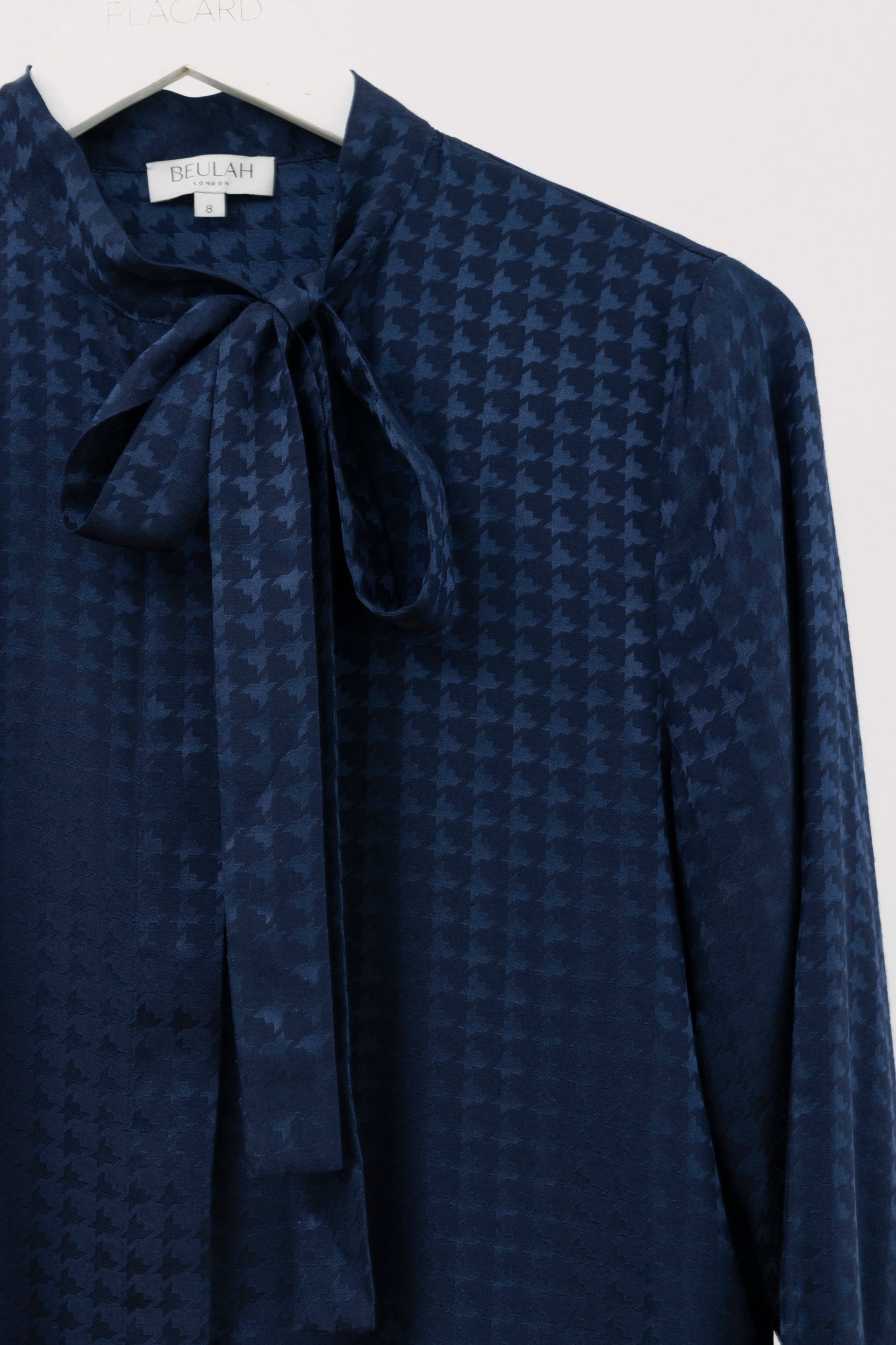 Blusa BEULAH. Modelo Bonnie jacquard, elaborada con delicado patrón geométrico en relieve que aporta textura y profundidad visual. Presenta un diseño fluido de líneas limpias, cuello alto sutil con detalle femenino y mangas largas con caída suave. Su silueta elegante lo convierte en una prenda versátil, perfecta para ocasiones formales como para elevar looks más relajados.