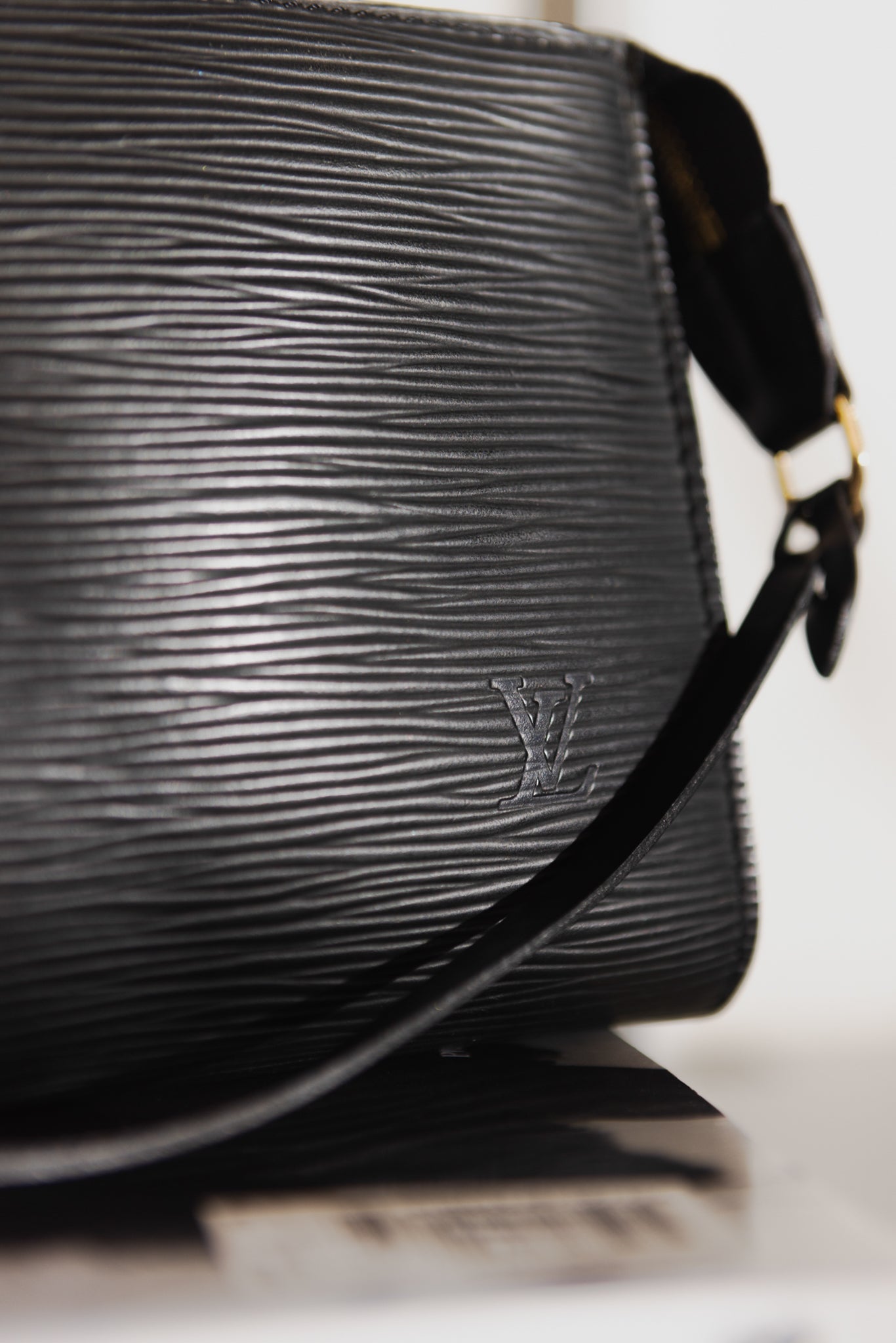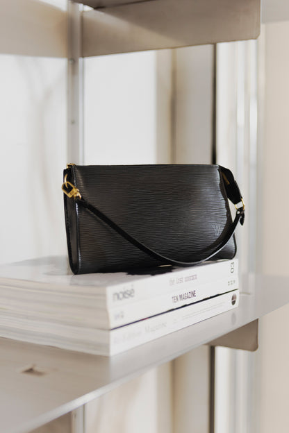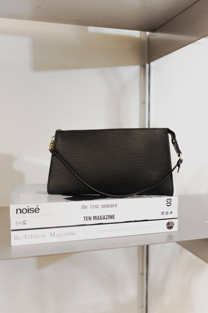 Bolso LOUIS VUITTON. Modelo Pochette, confeccionado en piel Epi su diseño de silueta horizontal y líneas limpias lo convierten en una pieza versátil y sofisticada. Incluye una correa de piel extraíble, que permite llevarlo cómodamente al hombro o como un elegante clutch.