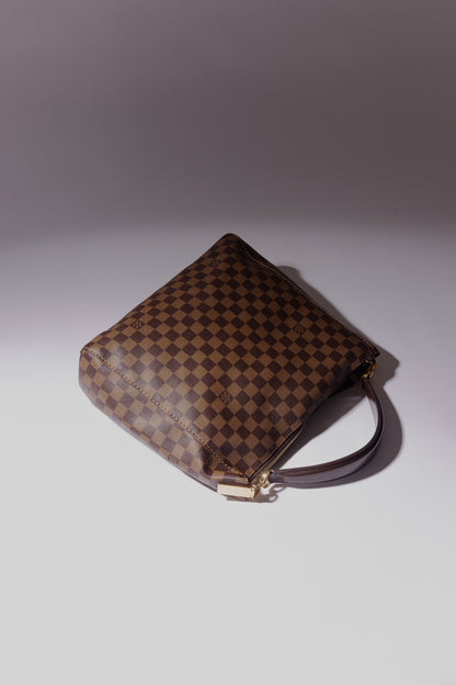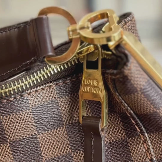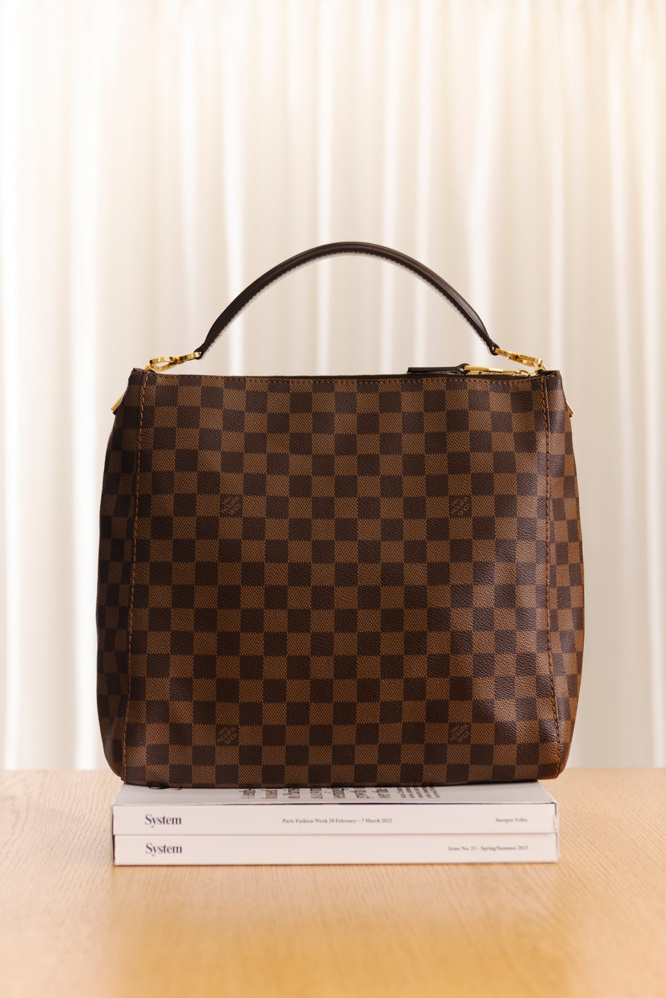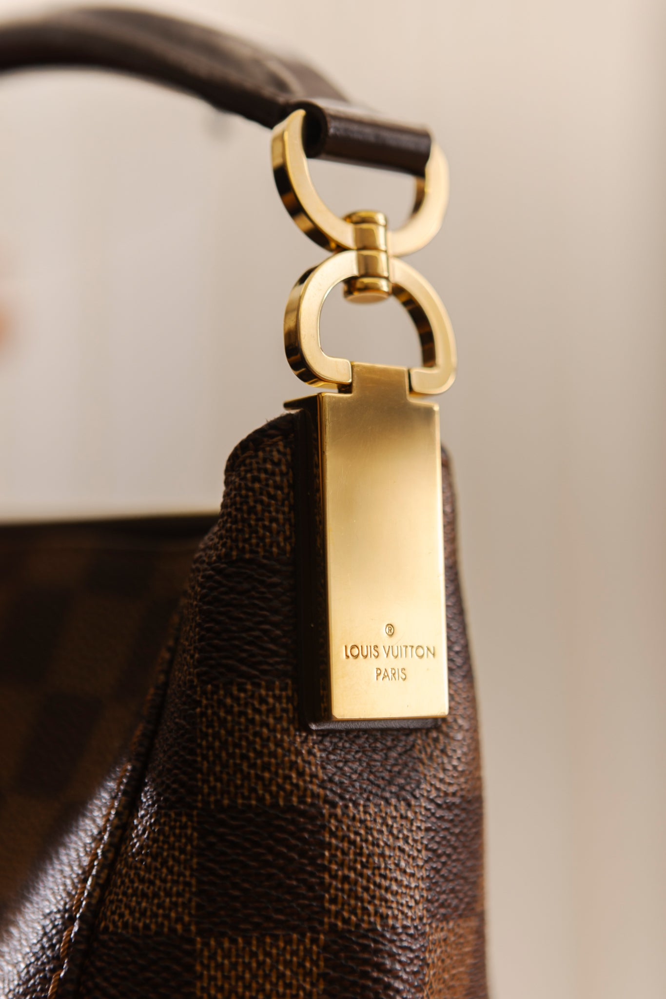 Bolso LOUIS VUITTON. Modelo  Portobello GM, confeccionado en la moderna lona Damier Ebene. Este elegante bolso de hombro esta finamente elaborado en lona revestida en color marrón. Cuenta con una correa de hombro de cuero y herrajes dorados de latón pulido. Cierre superior, interior de microfibra marrón oscuro con cremallera y bolsillo.