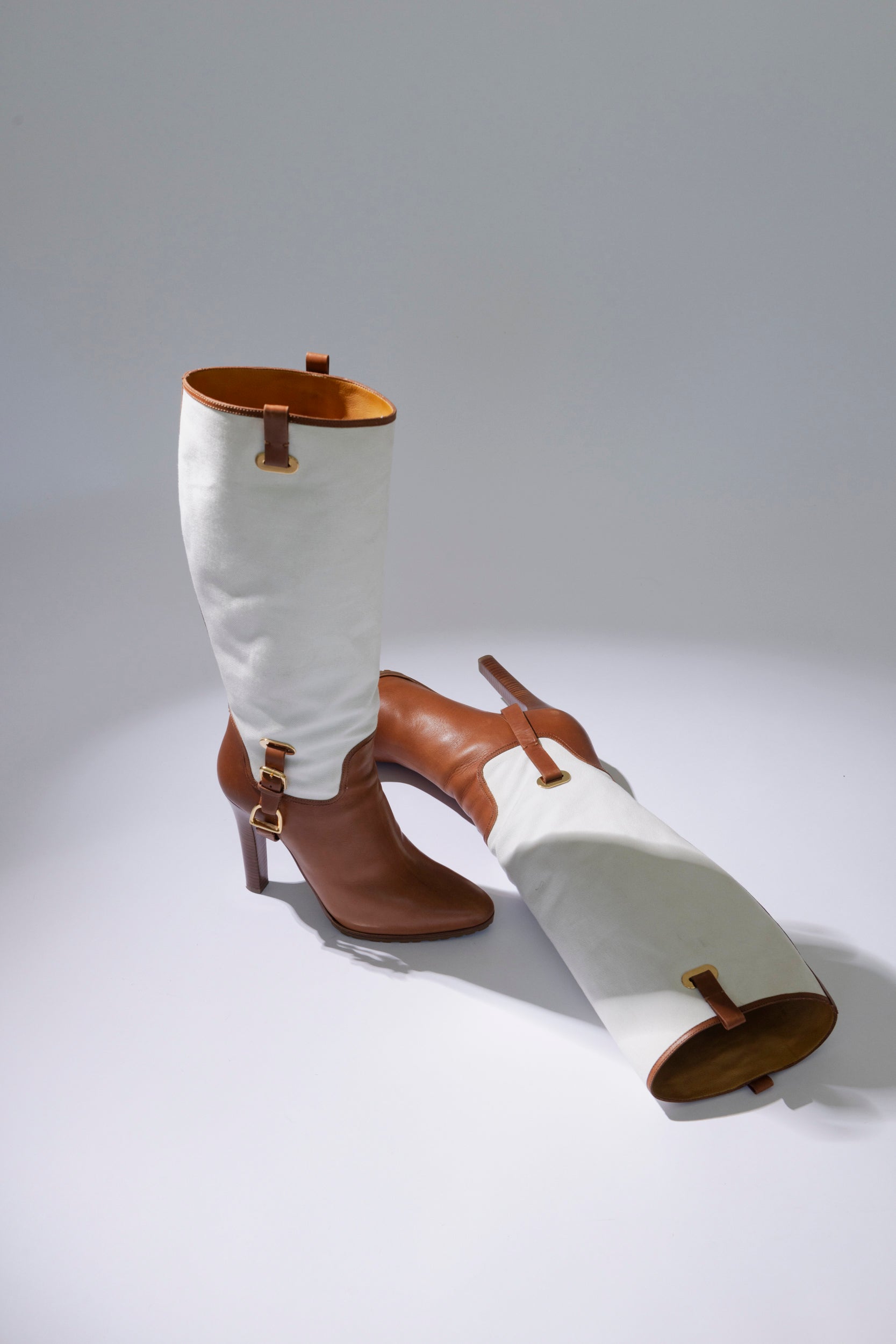 Botas RALPH LAUREN. Modelo de lona y cuero, este diseño de caña alta refleja la herencia ecuestre de la firma, destacando una correa decorativa alrededor del tobillo que aporta un toque clásico y refinado. Su taco de cuero apilado añade sofisticación y comodidad, permitiendo un uso elegante durante todo el día. Una pieza atemporal que combina artesanía, elegancia y funcionalidad.