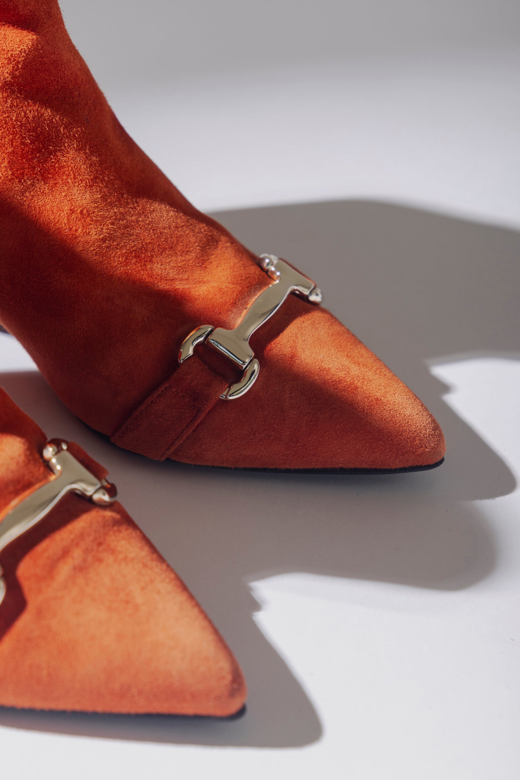 Botines PRETTY BALLERINAS. Modelo Angelis, confeccionados en color naranja con punta fina que estiliza la silueta del pie. Cuentan con un detalle metálico frontal que aporta sofisticación y un cierre lateral con cremallera para un calce cómodo y seguro. Su taco bajo y estable los hace ideales para un look moderno y versátil, combinando estilo y confort en cualquier ocasión.