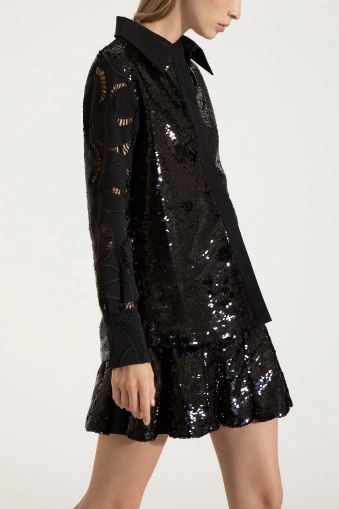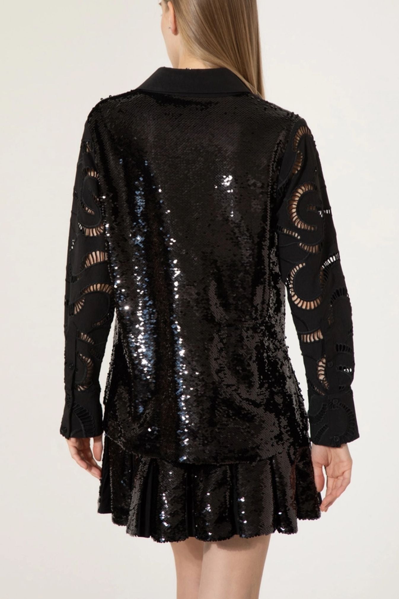 Camisa JAZMÍN CHEBAR. Modelo Brilliant, combina diseño artesanal y brillo sutil. Presenta mangas largas en broderie, con delicados calados que aportan textura y feminidad, mientras que el frente y la espalda están bordados en lentejuelas, creando un contraste elegante y moderno. Cuenta con cartera oculta, que mantiene una estética limpia y minimalista y puños anchos que realzan el diseño y aportan estructura. Ideal para elevar looks de día o para ocasiones especiales.