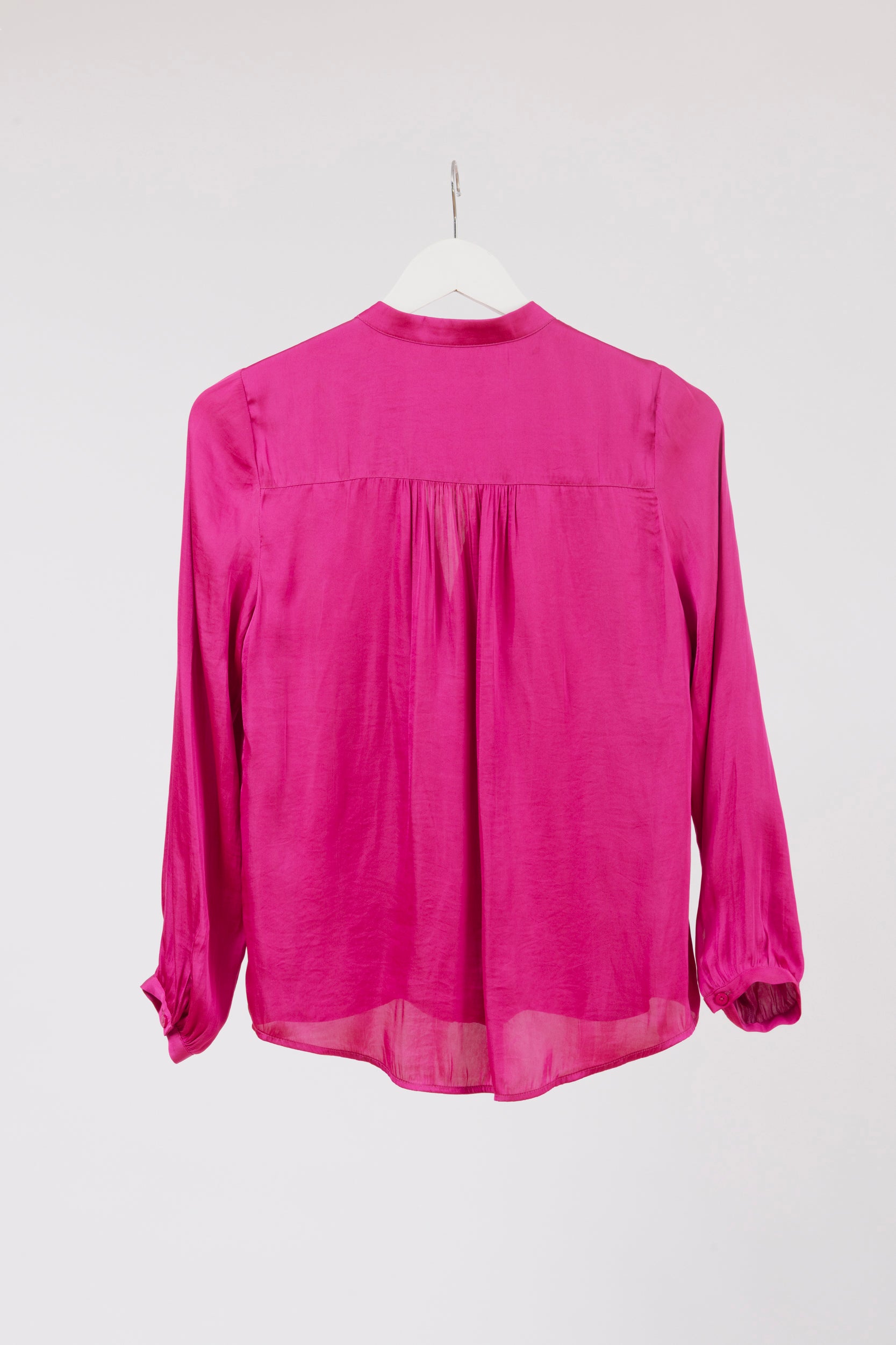 Camisa RAPSODIA. Modelo Magic Plain, de manga larga y cuello mao, con una silueta femenina y atemporal. Confeccionada en un tejido suave y liviano, presenta cartera de botones ocultos al tono para un acabado limpio y delicado. Los detalles de alforzas en los hombros y los frunces aportan textura y movimiento, reflejando un estilo bohemio y sofisticado.