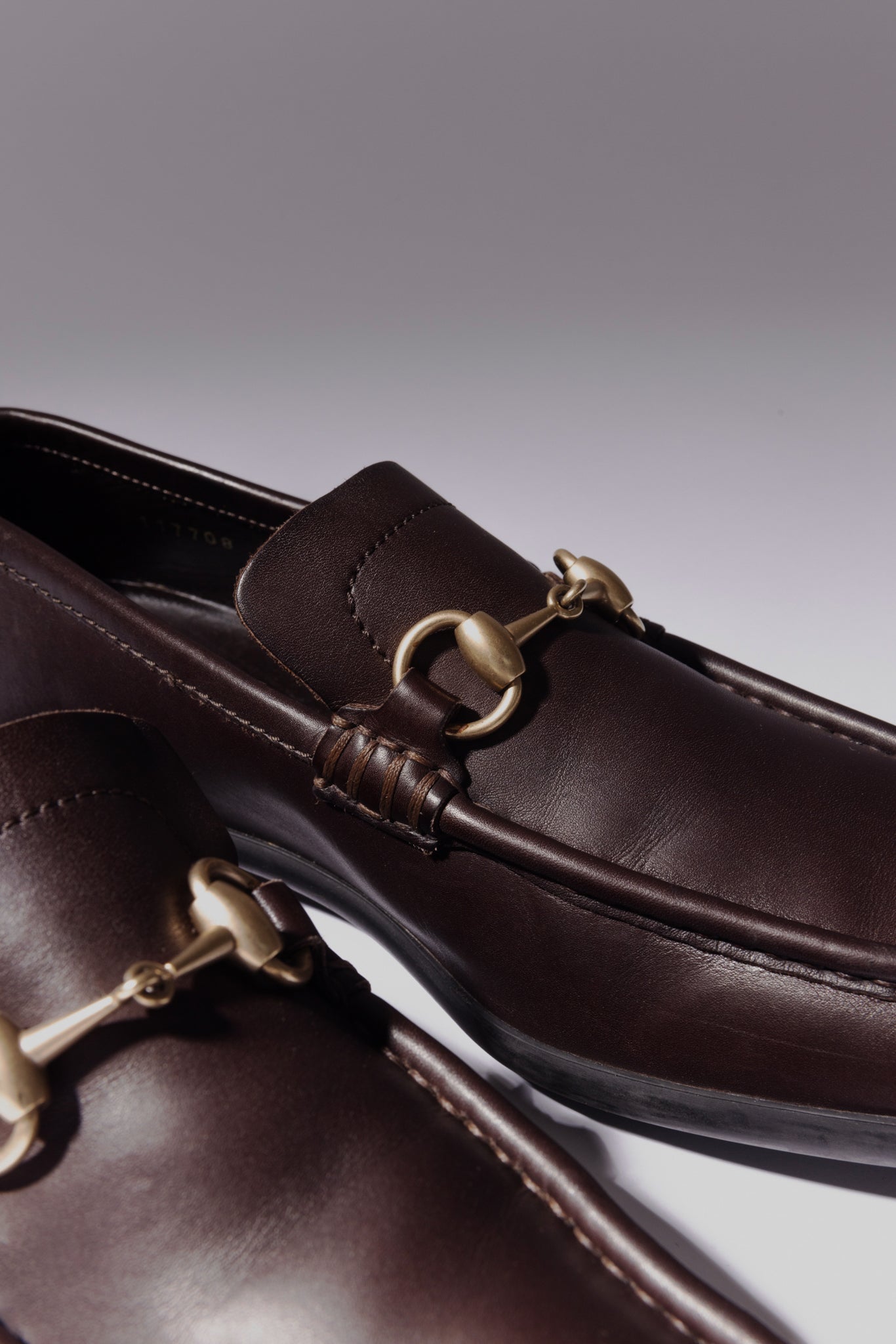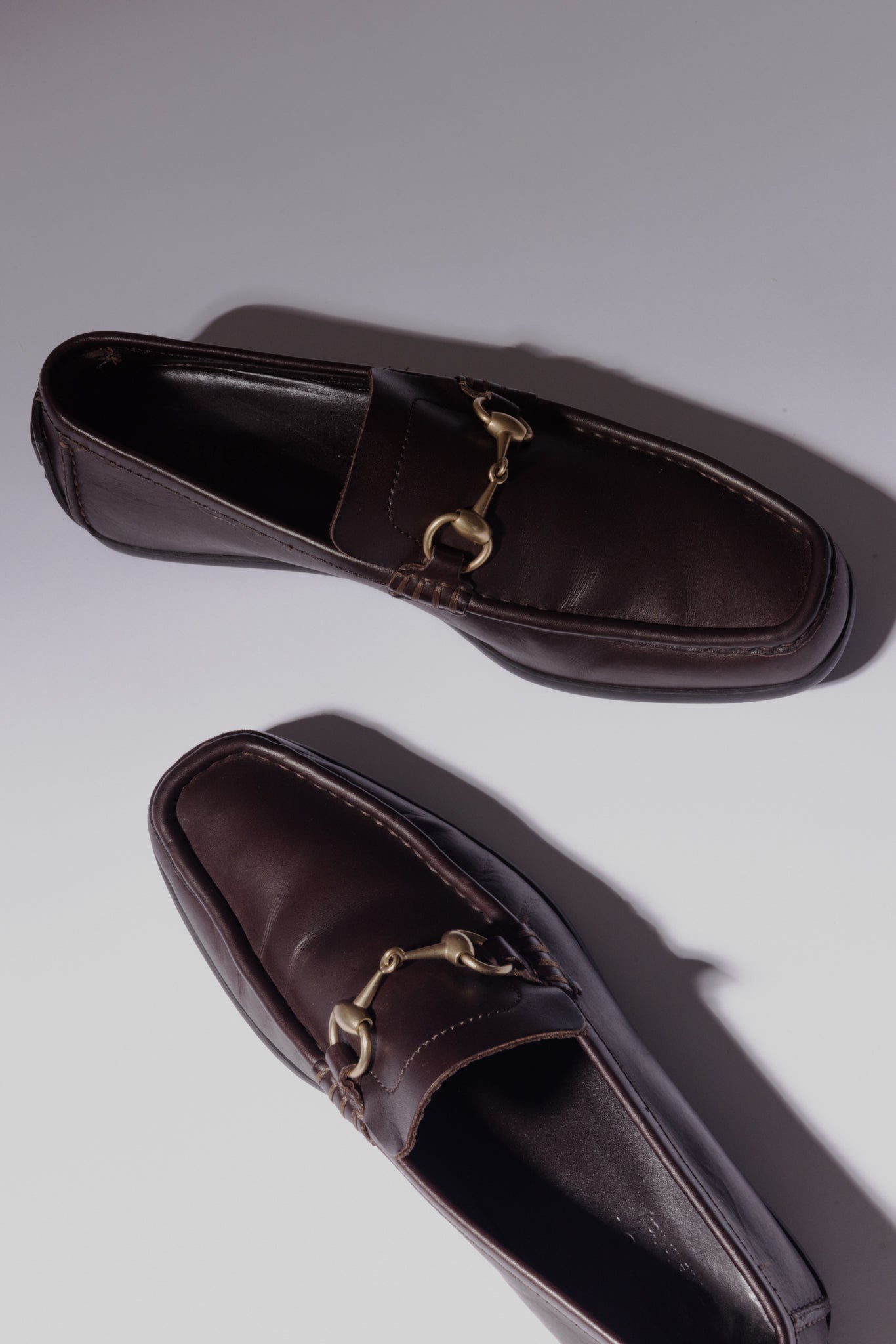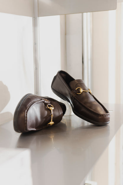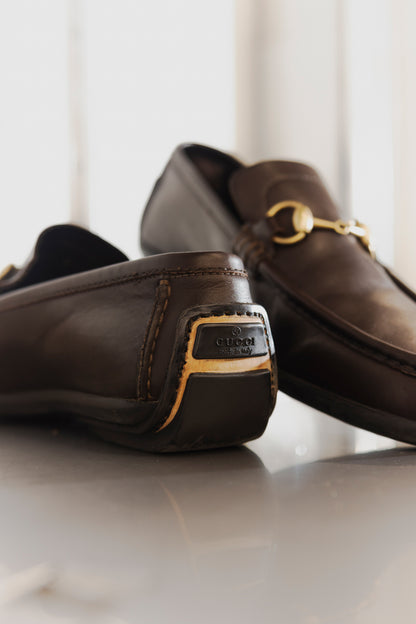 Mocasines GUCCI. Modelo confeccionado en cuero, color marrón oscuro son un ícono de la moda con el inconfundible detalle metálico horsebit en tono dorado envejecido. Ofrecen un estilo sofisticado y versátil, su diseño slip-on, de silueta clásica y terminación artesanal, los convierte en el complemento perfecto para atuendos tanto formales como casuales.