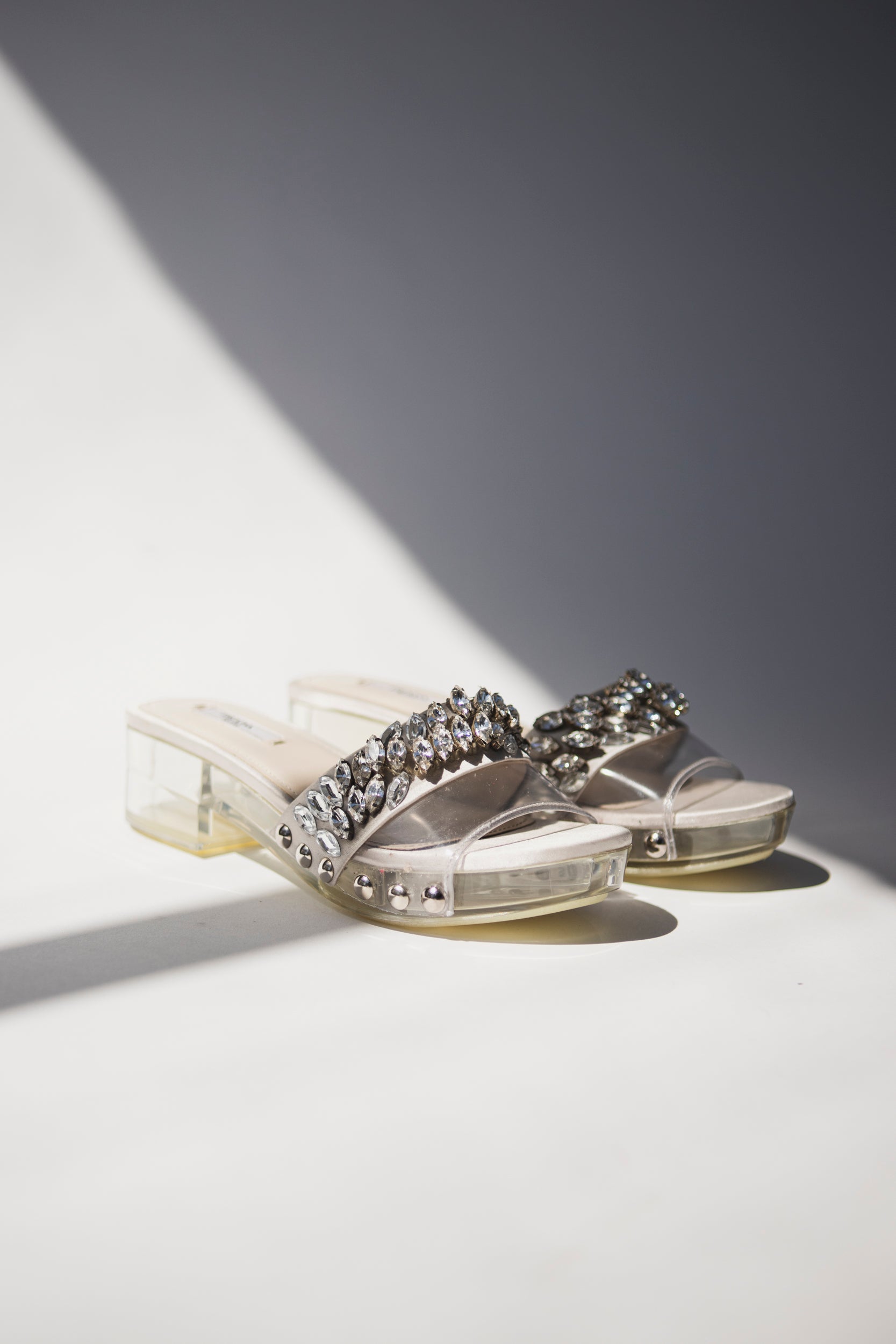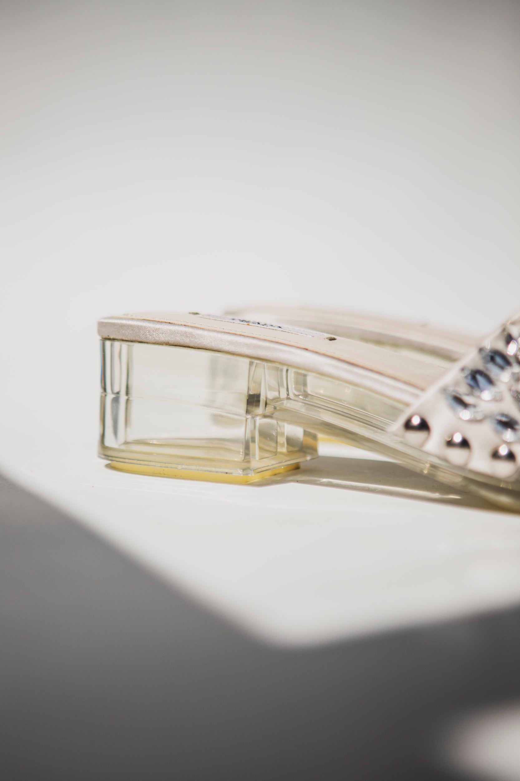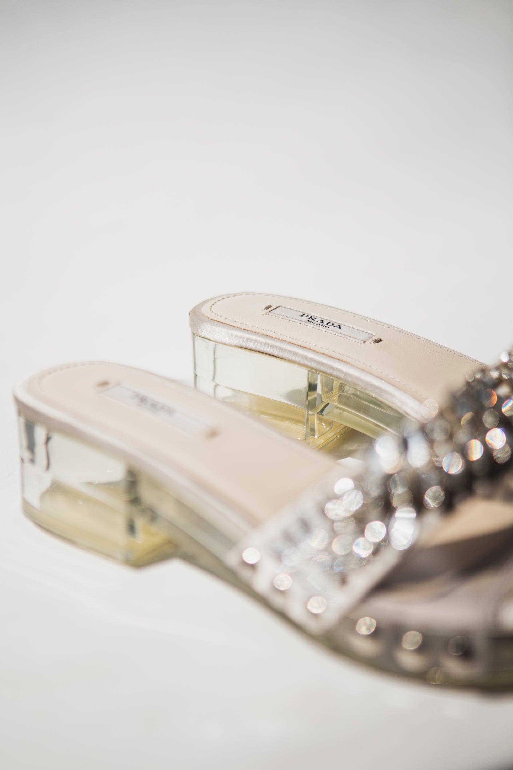 Sandalias PRADA. Modelo de plataforma, destacan por su diseño vanguardista que combina glamour y modernidad. Presentan plataforma con tachas y taco cuadrado transparente, aportando ligereza visual y un efecto arquitectónico único. El empeine con cristales y satén en color gris añade brillo y sofisticación, elevando cualquier look.