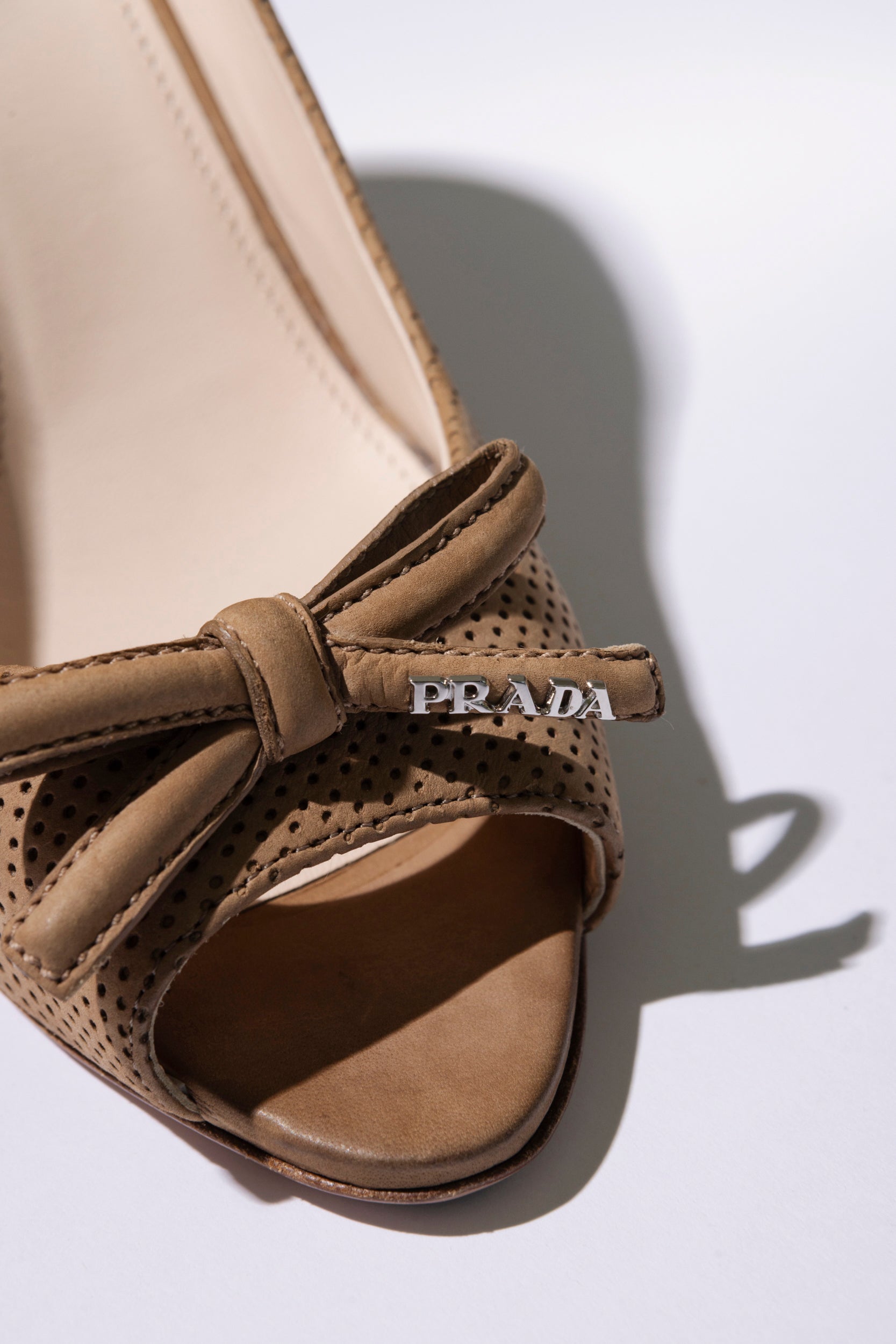 Stiletto PRADA. Modelo Traf con diseño micro-perforado que les da un aire ligero y contemporáneo. Presentan puntera abierta y un delicado lazo en el empeine, adornado con herrajes metálicos grabados con logo de la firma. El interior en piel asegura comodidad, mientras que el tacón medio-fino estiliza con elegancia. Un modelo clásico y versátil que se adapta a todo tipo de looks.