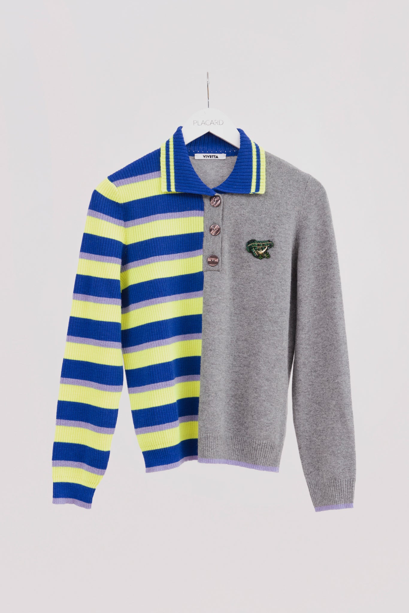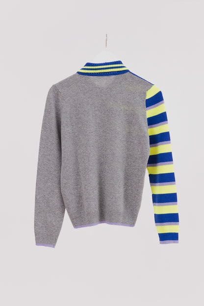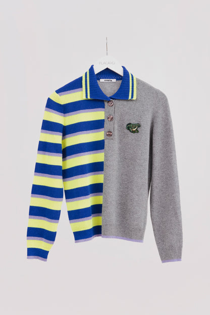 Sweaters VIVETTA. Modelo bicolor con rayas, destaca por su diseño asimétrico y creativo, característico de la marca italiana reconocida por su estilo irreverente, femenino y artístico. Confeccionado en materiales de calidad, presenta combinación única de colores y texturas: un lado con rayas en verde, azul y morado, y el otro gris liso, ofreciendo un contraste visual original y vanguardista.