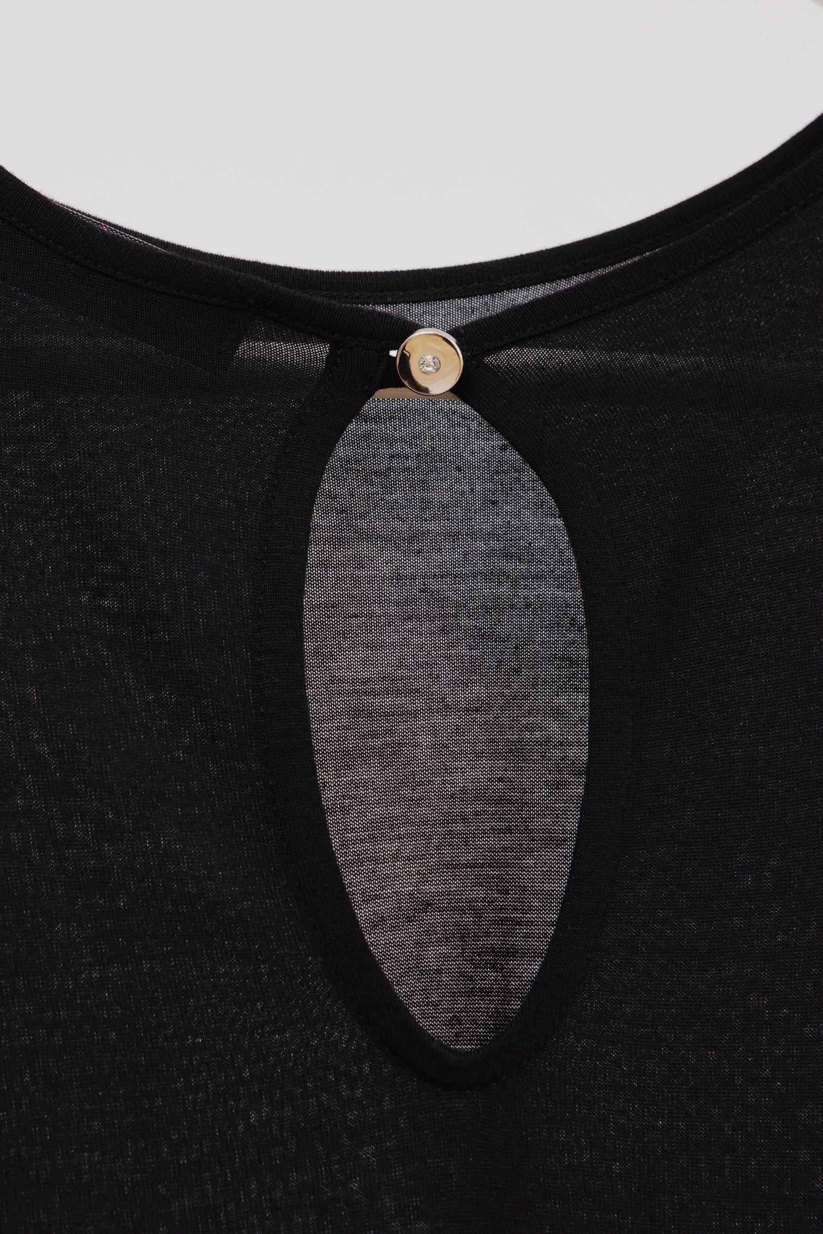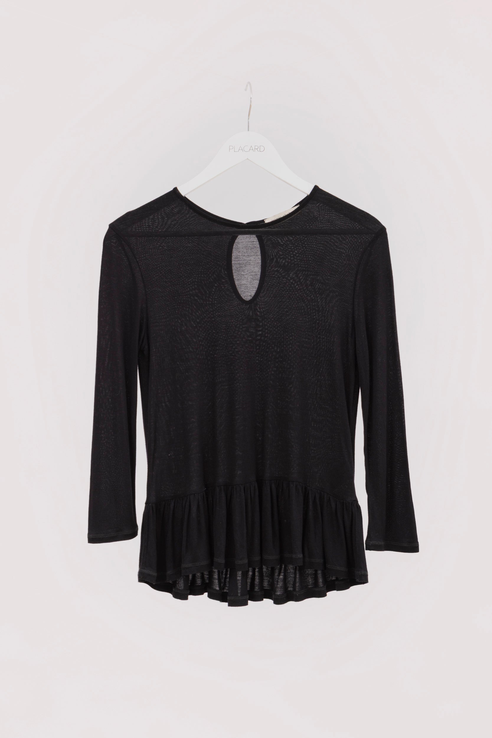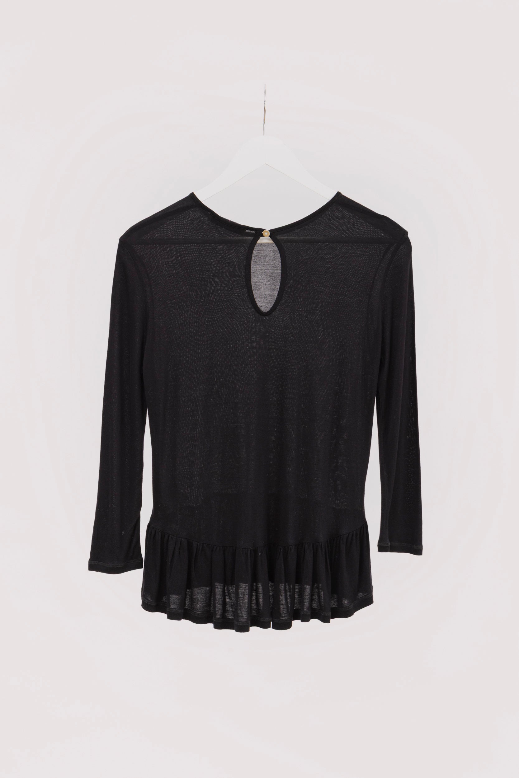 Top JAZMIN CHEBAR. Modelo cuello redondo y corte holgado, tela delicada de diseño semi-transparente con mangas largas y un sutil vuelo en el dobladillo que aporta movimiento y feminidad. Cierre con botón en espalda para un acabado elegante y cómodo. Ideal para elevar looks casuales.