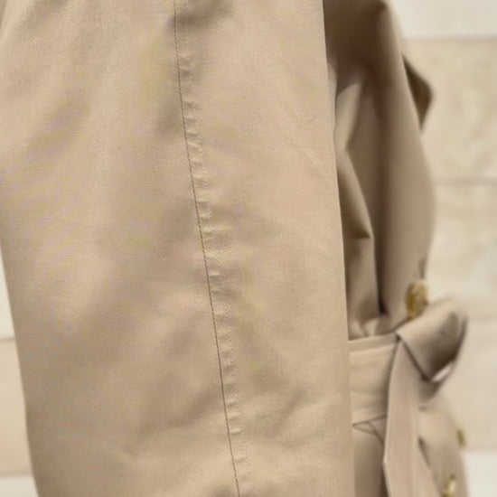 Trench BURBERRY. Modelo Gabardina Oversize con doble botonadura, cinturón removible, con herrajes metálicos revestidos en cuero, puños con correas, dos bolsillos laterales con solapa, forro con cuadrille. Abertura en la parte posterior y botón en el ruedo.