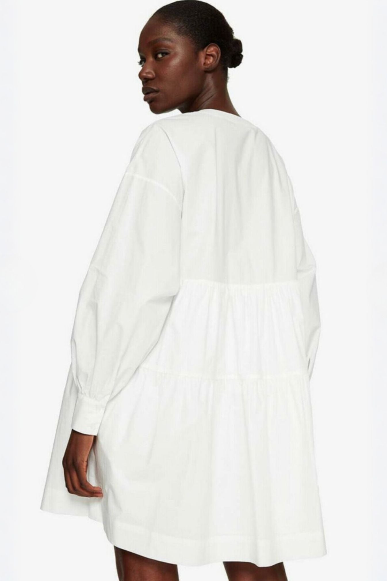 Vestido ANINE BING. Modelo Addison, en tono blanco de diseño limpio y sofisticado que refleja esencia del lujo minimalista de la marca. Su silueta fluida y femenina lo convierte en una pieza versátil y atemporal, perfecta para elevar cualquier look con naturalidad. Presenta manga abullonada con caída suave, escote con abertura frontal que estiliza el torso y un corte relajado  que aporta movimiento y comodidad.