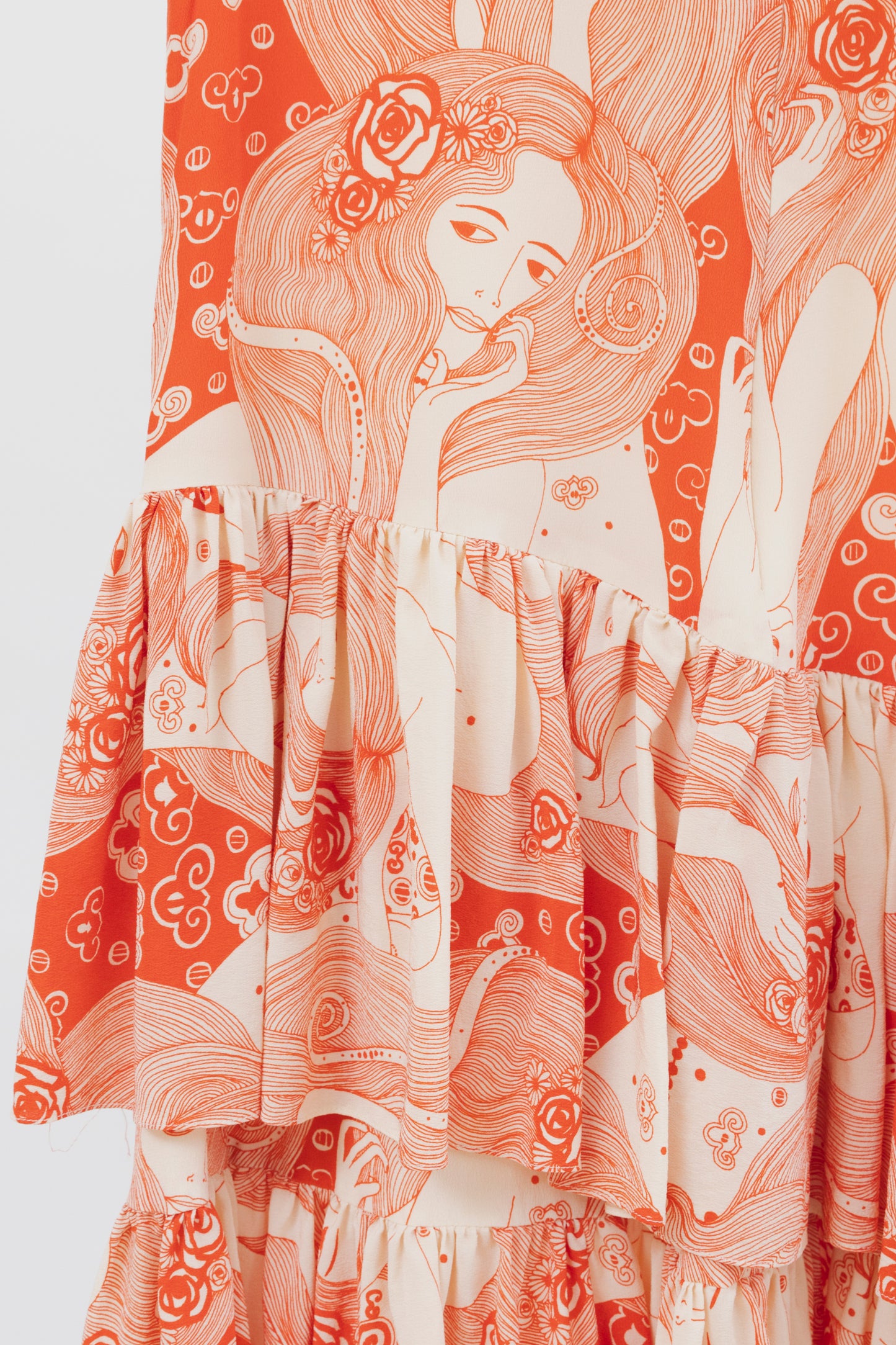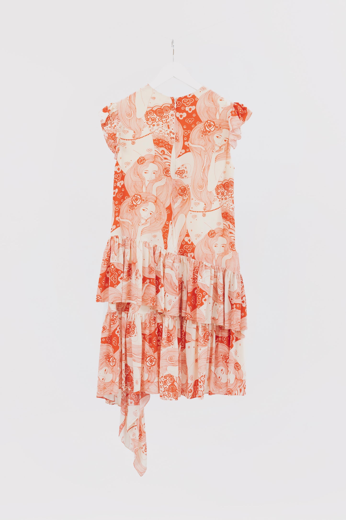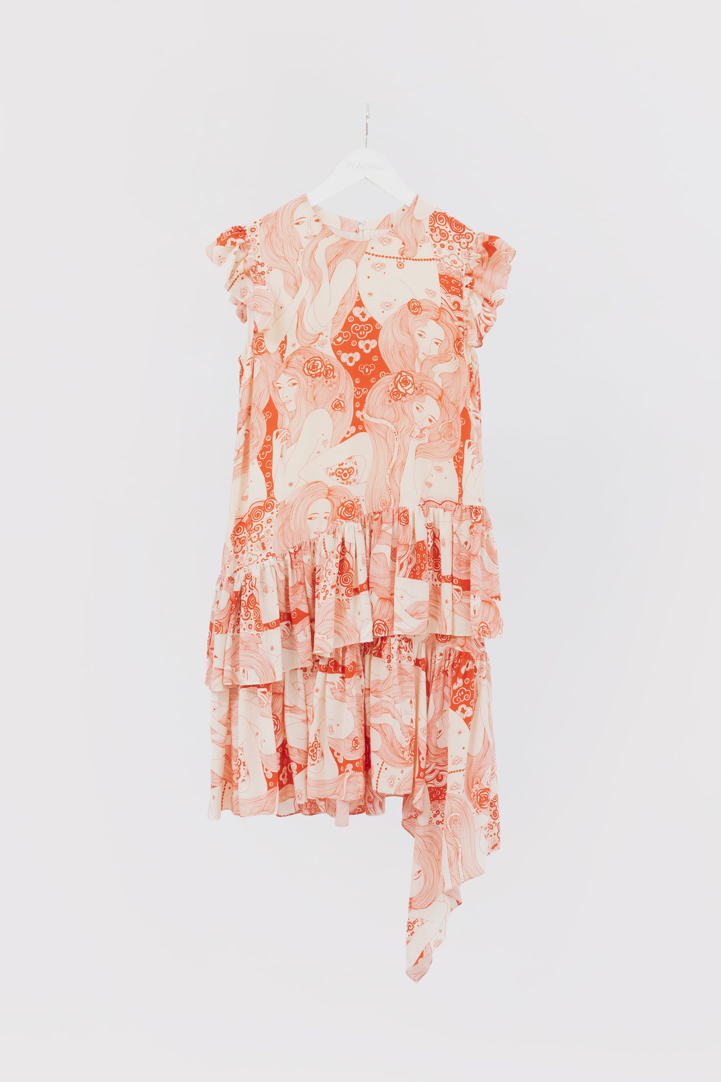 Vestido ALEXANDER MCQUEEN. Modelo con volados en diagonal, cremallera invisible en la espalda, cuello redondo. Estampado de mujeres.
