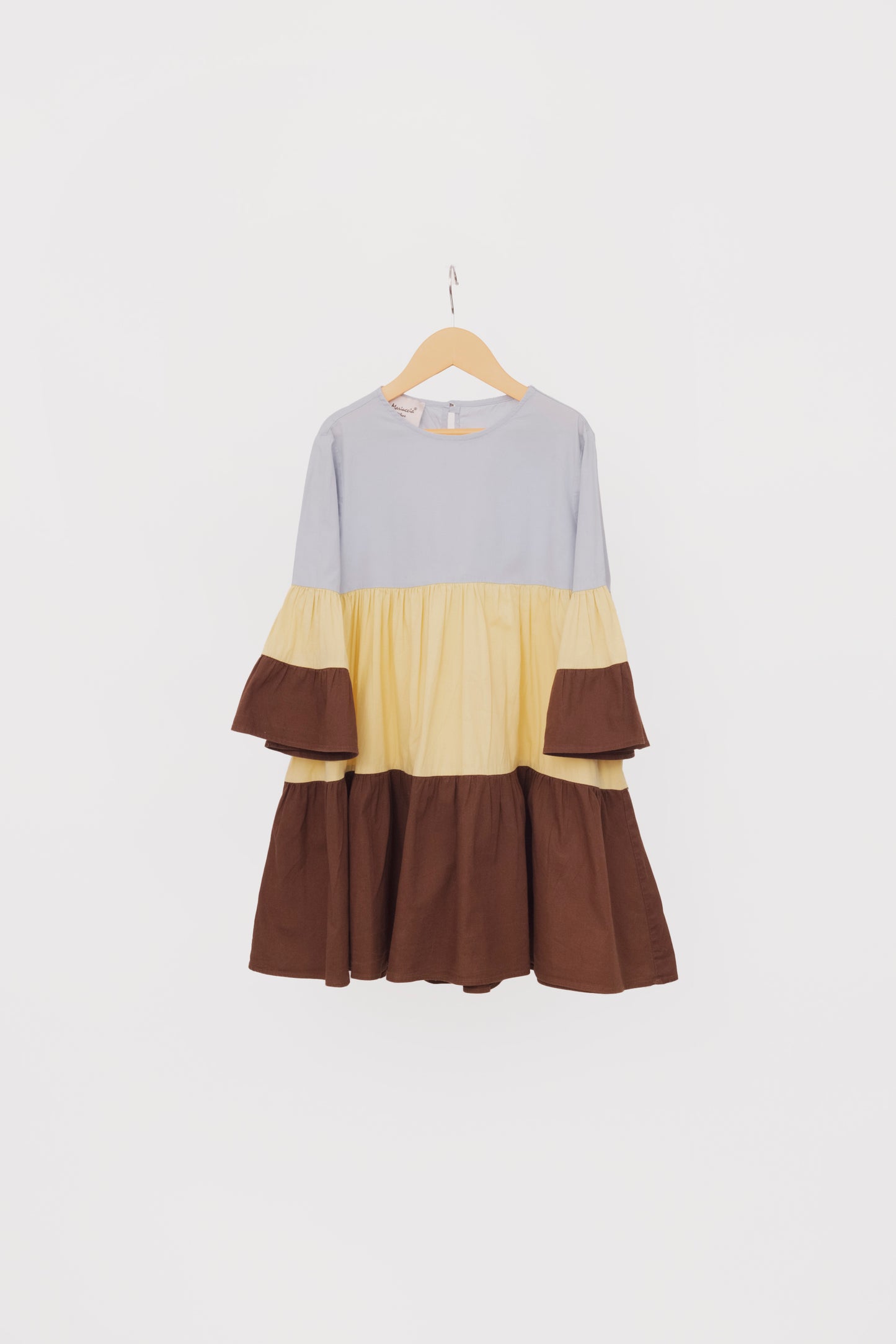 Vestido MARIUCCIA. Modelo tricolor amplio de escote redondo y mangas 3/4 con vuelos. Cierre de botón en la parte trasera.