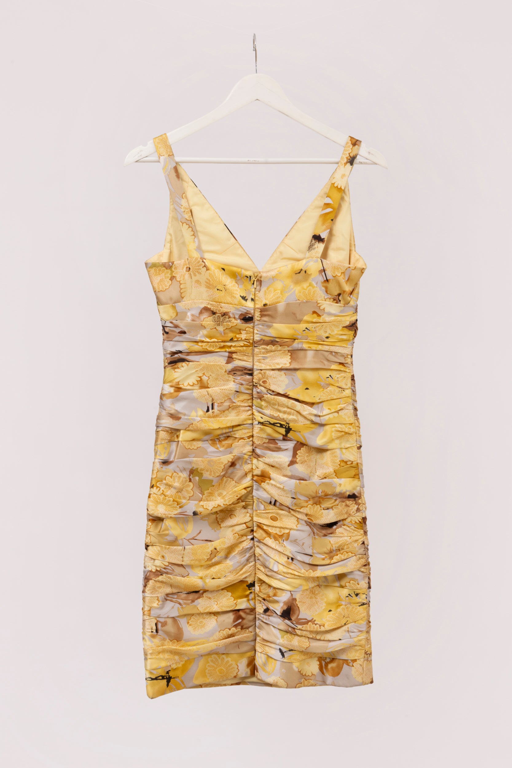 Vestido CARMEN MARC VALVO. Modelo con estampado floral en tonos amarillos, dorados y marrones. Su diseño corto y entallado realza la figura, mientras que el drapeado en la falda aporta textura y sofisticación. El escote en "V" cruzado con tirantes anchos ofrece un aire femenino y favorecedor, ideal para destacar en eventos especiales o cócteles.