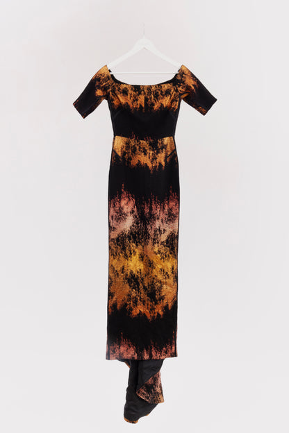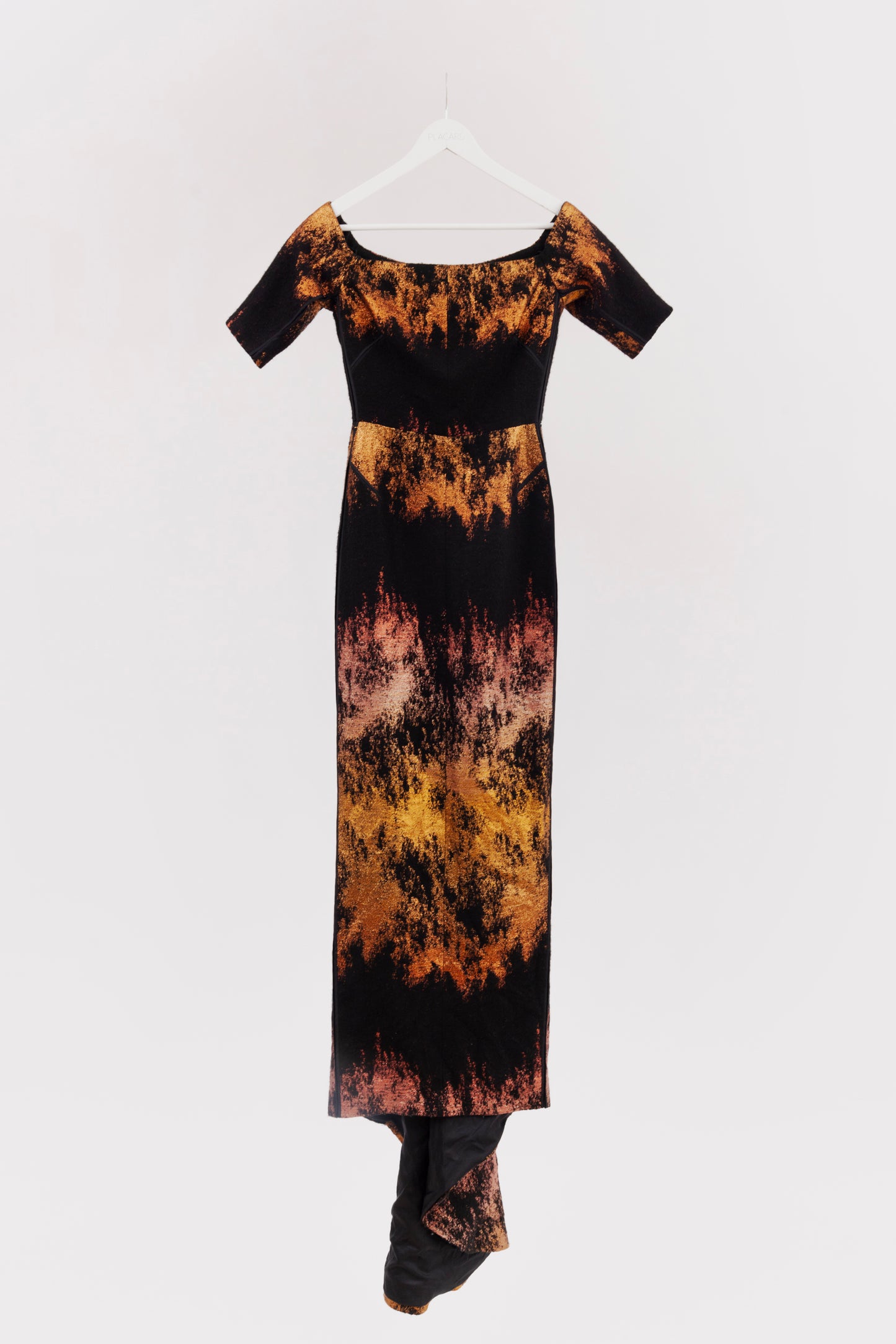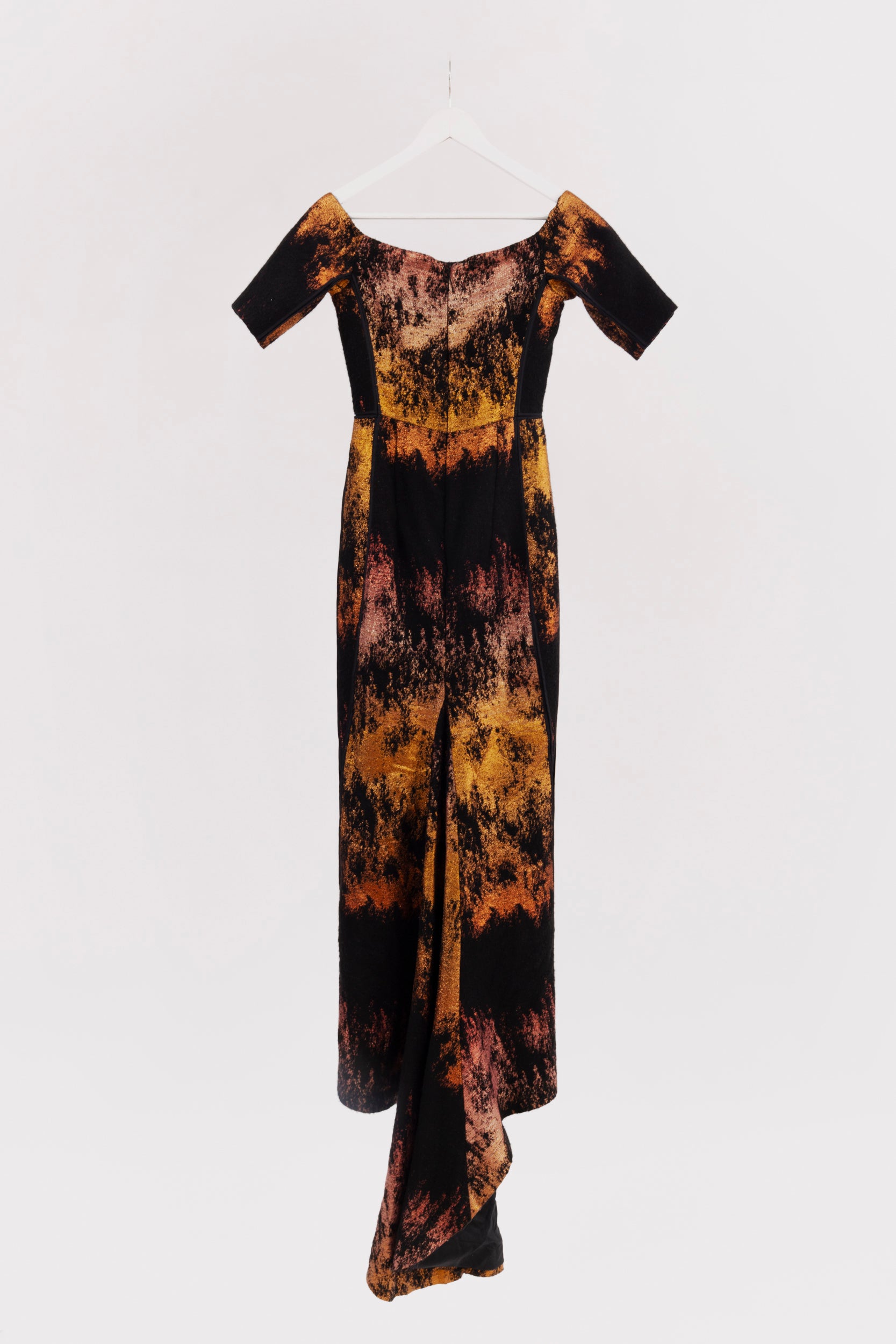 Vestido J. MENDEL. Modelo confeccionado en un exquisito jacquard con diseño abstracto pintado en color cobre, este vestido destaca por su escote cuadrado, hombros descubiertos y corte recto que estiliza la silueta. La cola posterior añade un toque dramático y refinado ideal para celebraciones especiales.