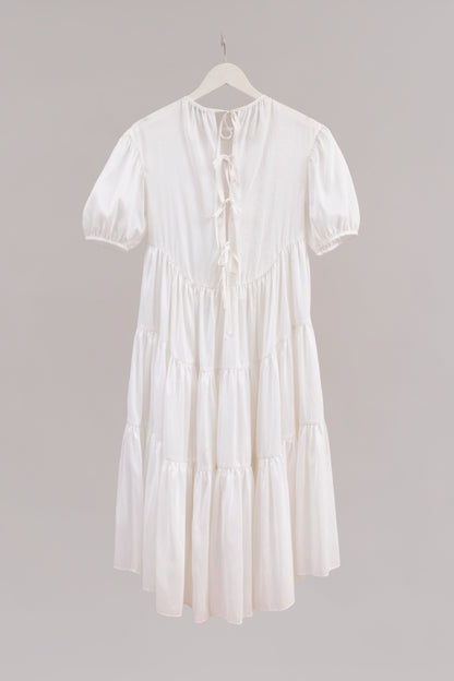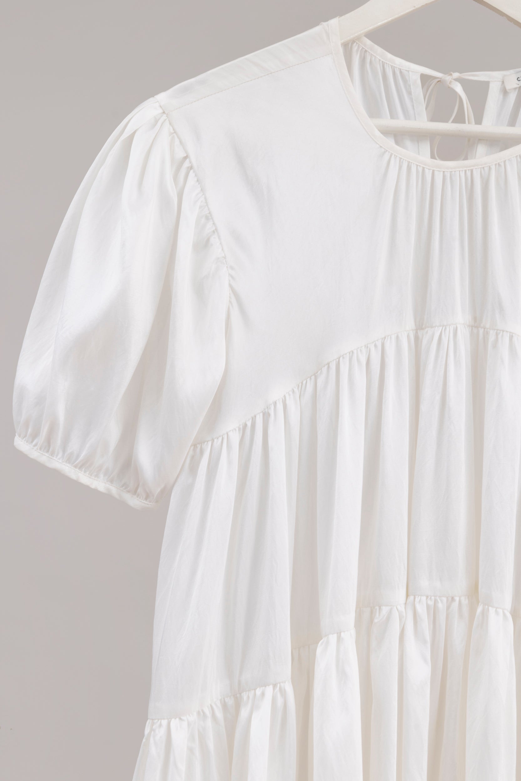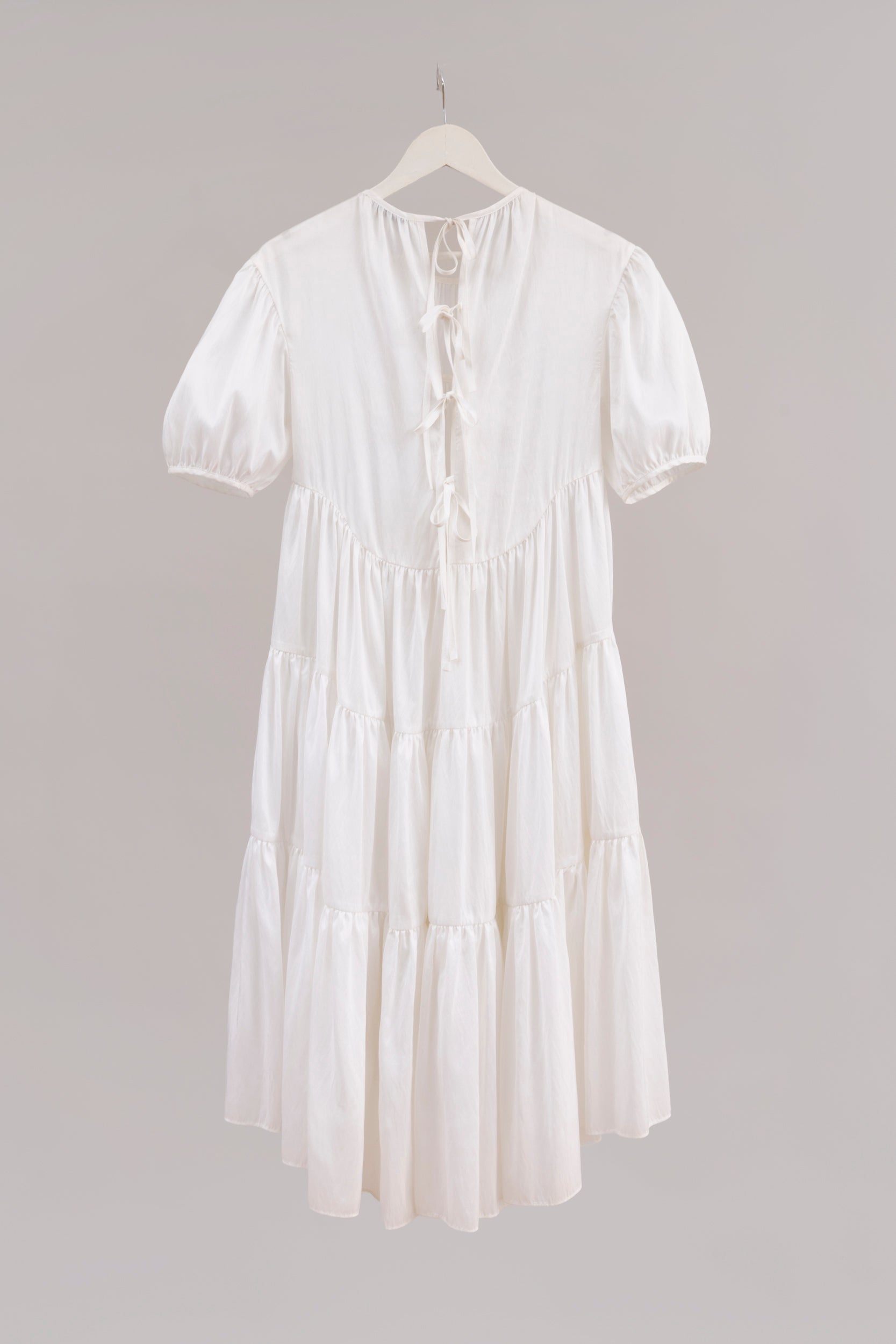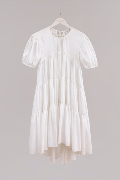 Vestido CECILIE BAHNSEN. Modelo midi, confeccionado en un delicado tono blanco su diseño voluminoso de falda ancha con capas que aportan versatilidad y movimiento, sus mangas abullonadas le aportan feminidad y sofisticación. Los tirantes finos ajustables en la espalda permiten un ajuste personalizado. Un diseño de lujo atemporal.