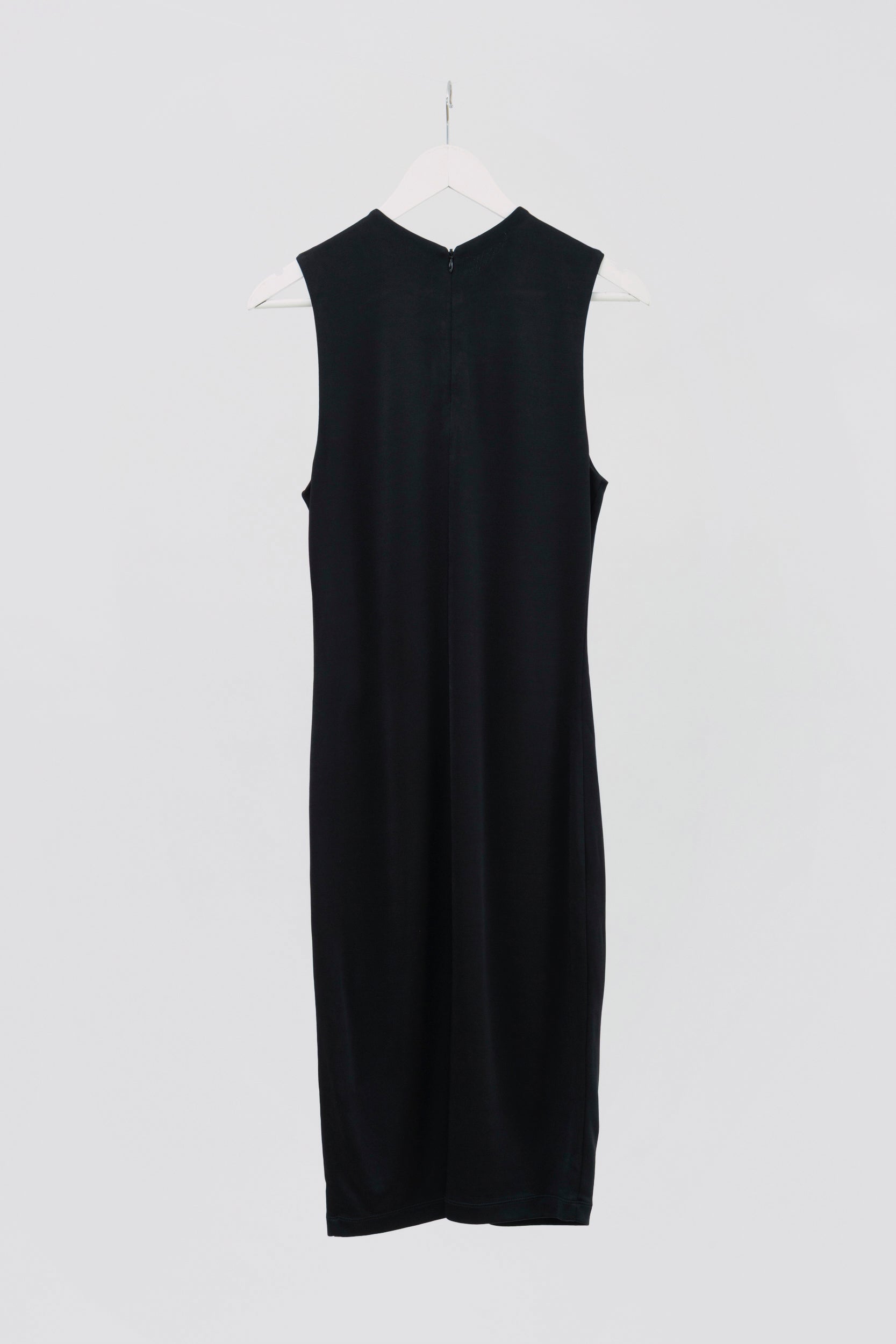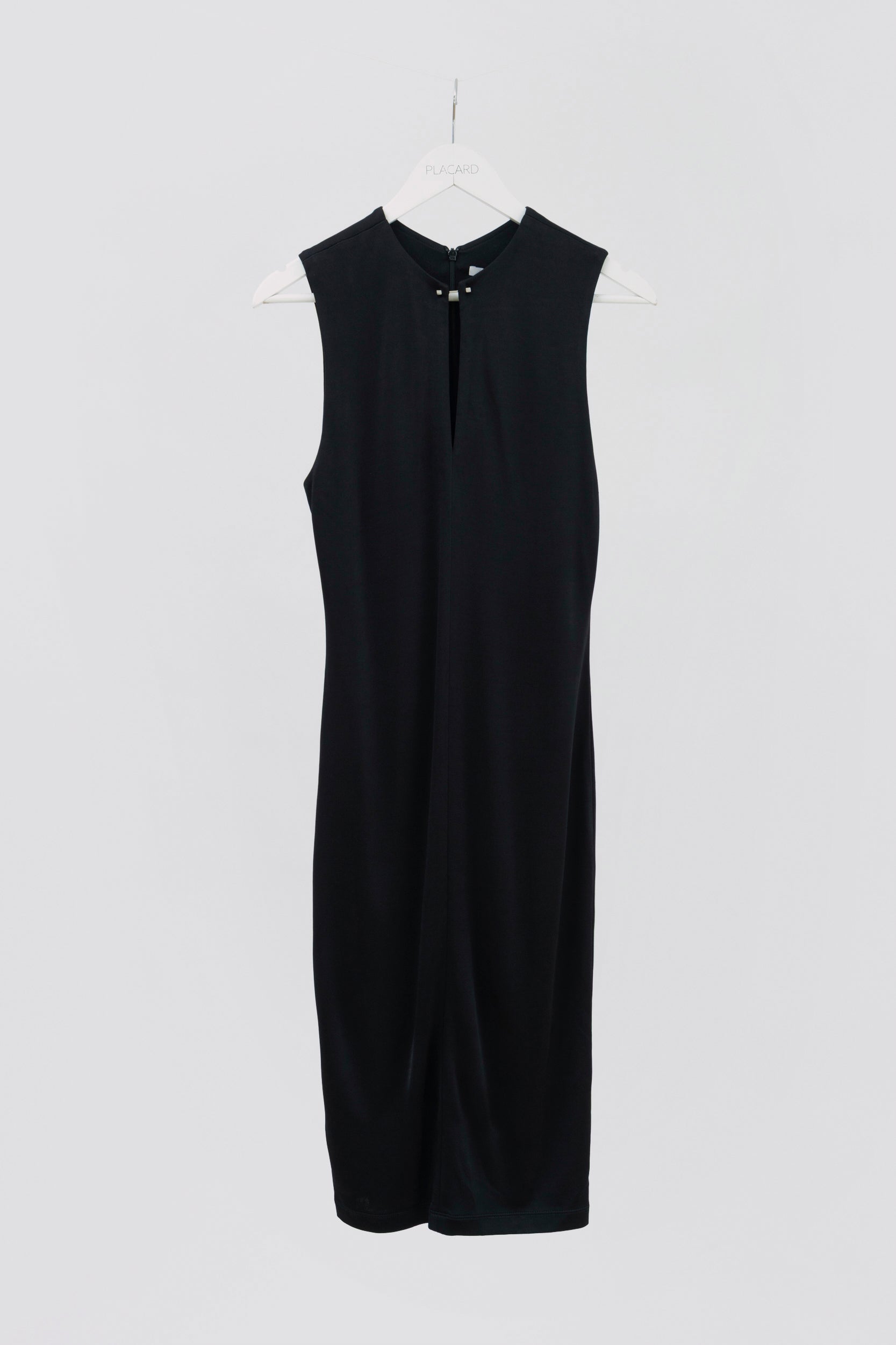 Vestido ALEXANDER WANG. Modelo de corte midi silueta slim, diseñado para realzar la figura con una estética moderna y minimalista. Destaca por su escote delantero con abertura sutil. acentuado por un detalle metálico discreto que aporta un toque distintivo. Su diseño sin mangas y estructura definida crean una silueta estilizada y contemporánea. Ideal para ocasiones especiales o para elevar looks de noche con carácter.