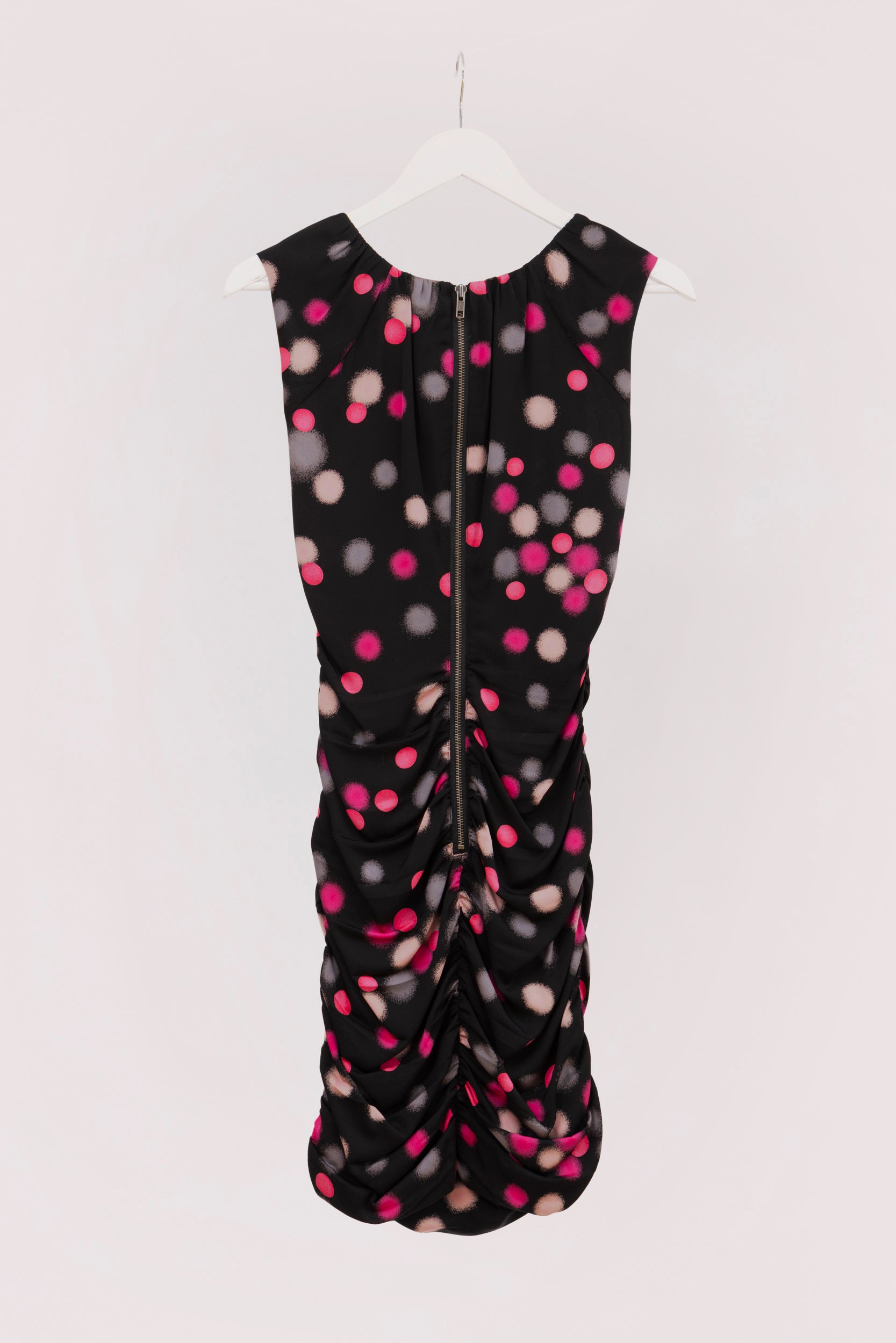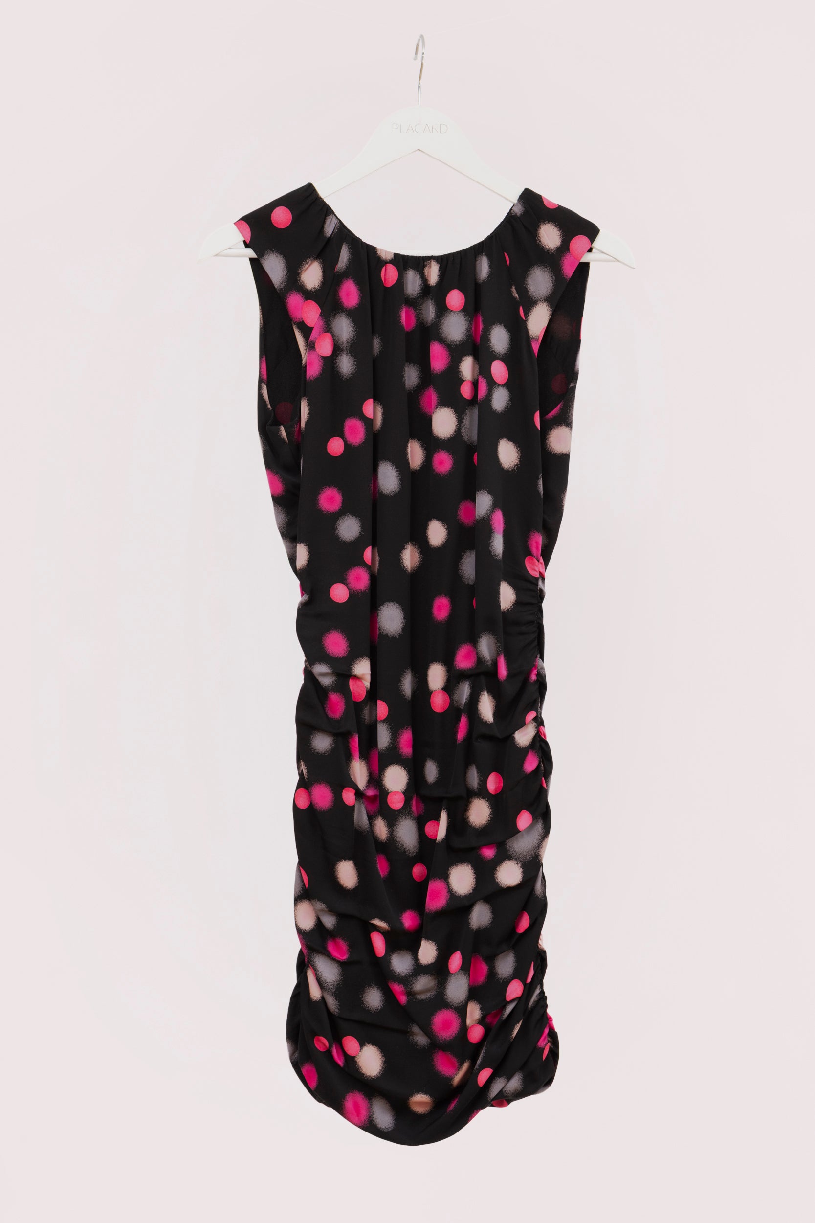 Vestido DIANE VON FURSTENBERG. Modelo Tulipán, con estampado de lunares multicolor que aporta un aire alegre y femenino. Su escote redondo realza la silueta con sencillez, mientras que la falda drapeada añade movimiento y un detalle distintivo al diseño. Una pieza versátil y elegante, ideal para destacar en cualquier ocasión.