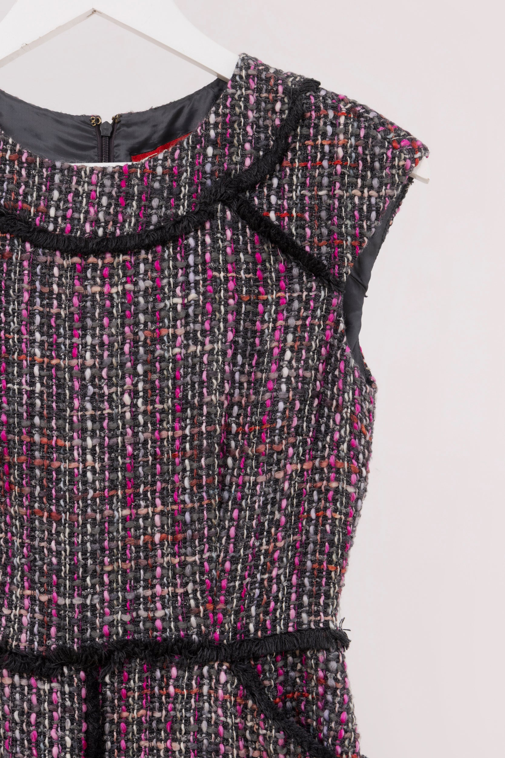 Vestido CAROLINA HERRERA. Modelo Midi, confeccionado en tweed multicolor su diseño en corte tubo estiliza la silueta, mientras que los ribetes negros aportan un contraste sofisticado. Incorpora bolsillos laterales funcionales y un cierre con cremallera en espalda, detalles que combinan practicidad con distinción. Una prenda atemporal que refleja el estilo refinado y moderno de la firma.