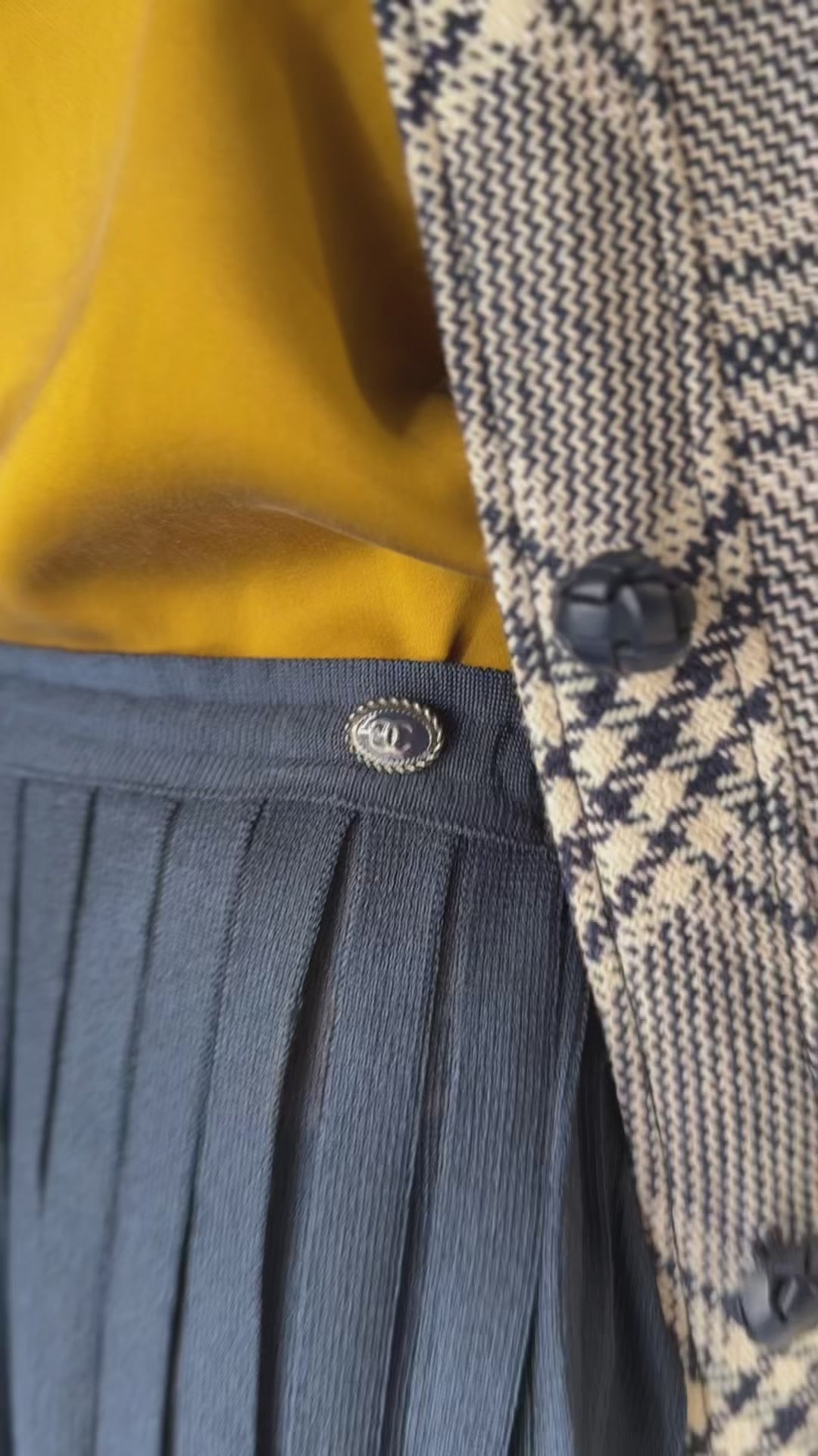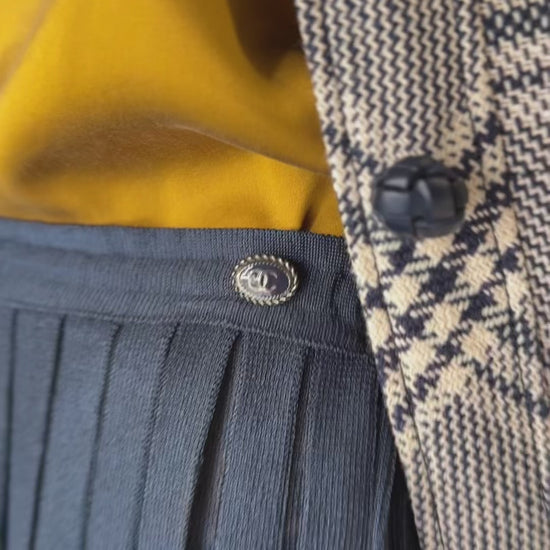 Vestido GUCCI. Modelo tipo jumper con botones de cuero entretejido en todo el largo. Estampado de cuadros. Dos bolsillos adelante.