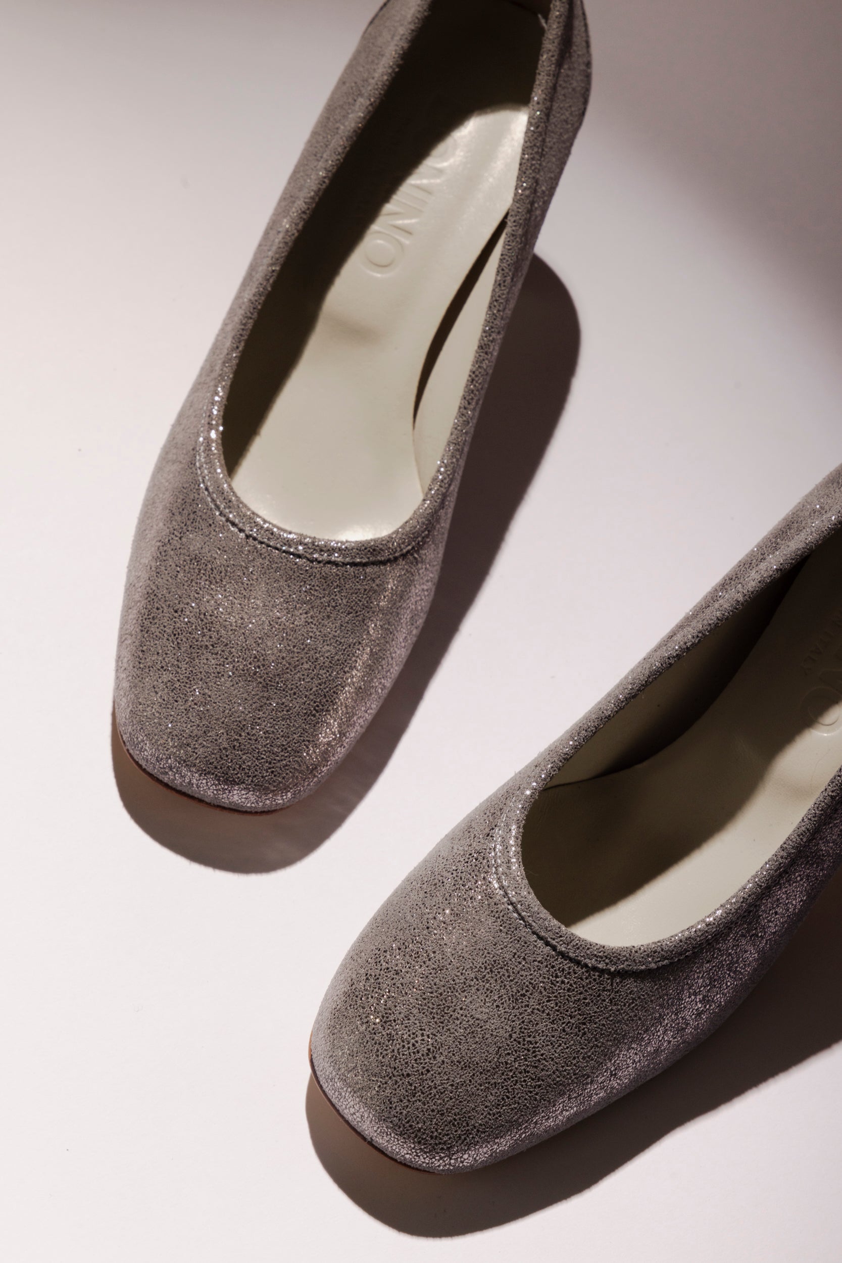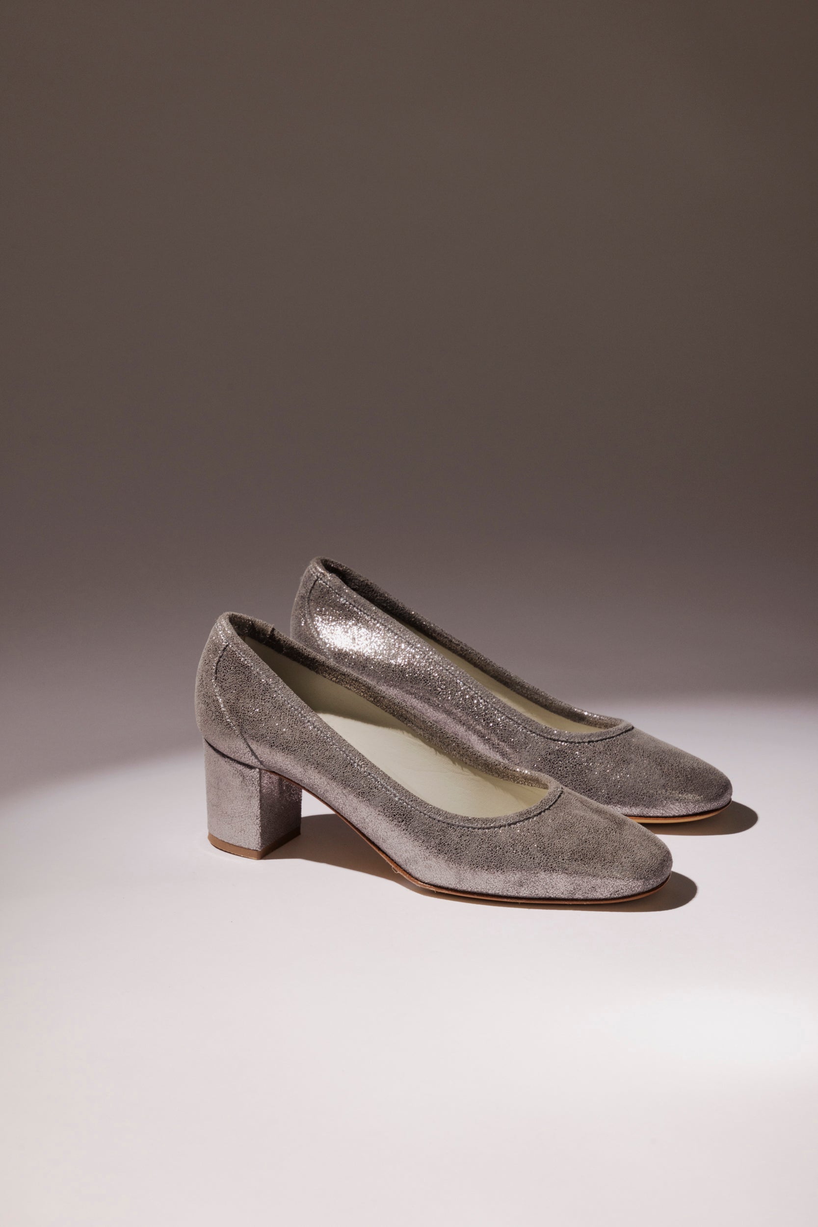 Zapatos BONINO. Modelo Silver, diseñados en un acabado plateado brillante, destacan por su punta redonda y su taco cuadrado, que ofrece elegancia y comodidad a la vez.